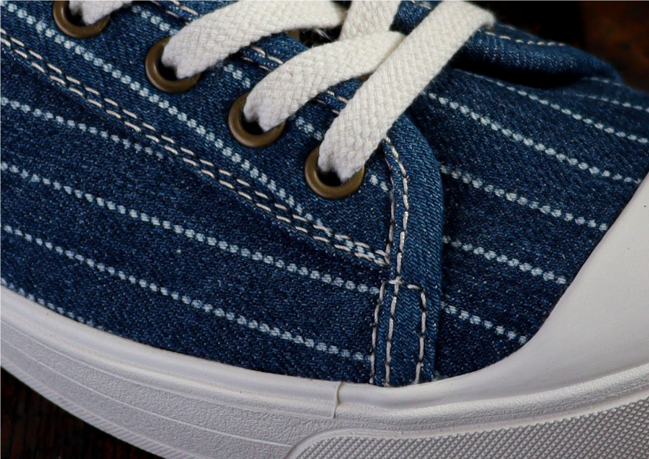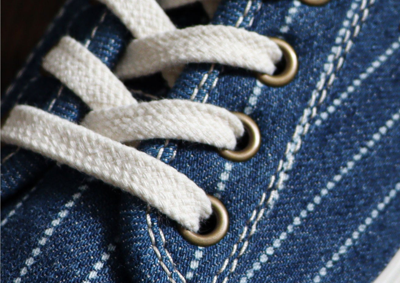 この春の新作は、そのレトロな雰囲気にマッチするヴィンテージ感のあるアッパーを採用。このスニーカーのために山陽染工株式会社が染色から抜染仕上げ加工までを国内のファクトリーで作り上げたオリジナルデニム生地です。