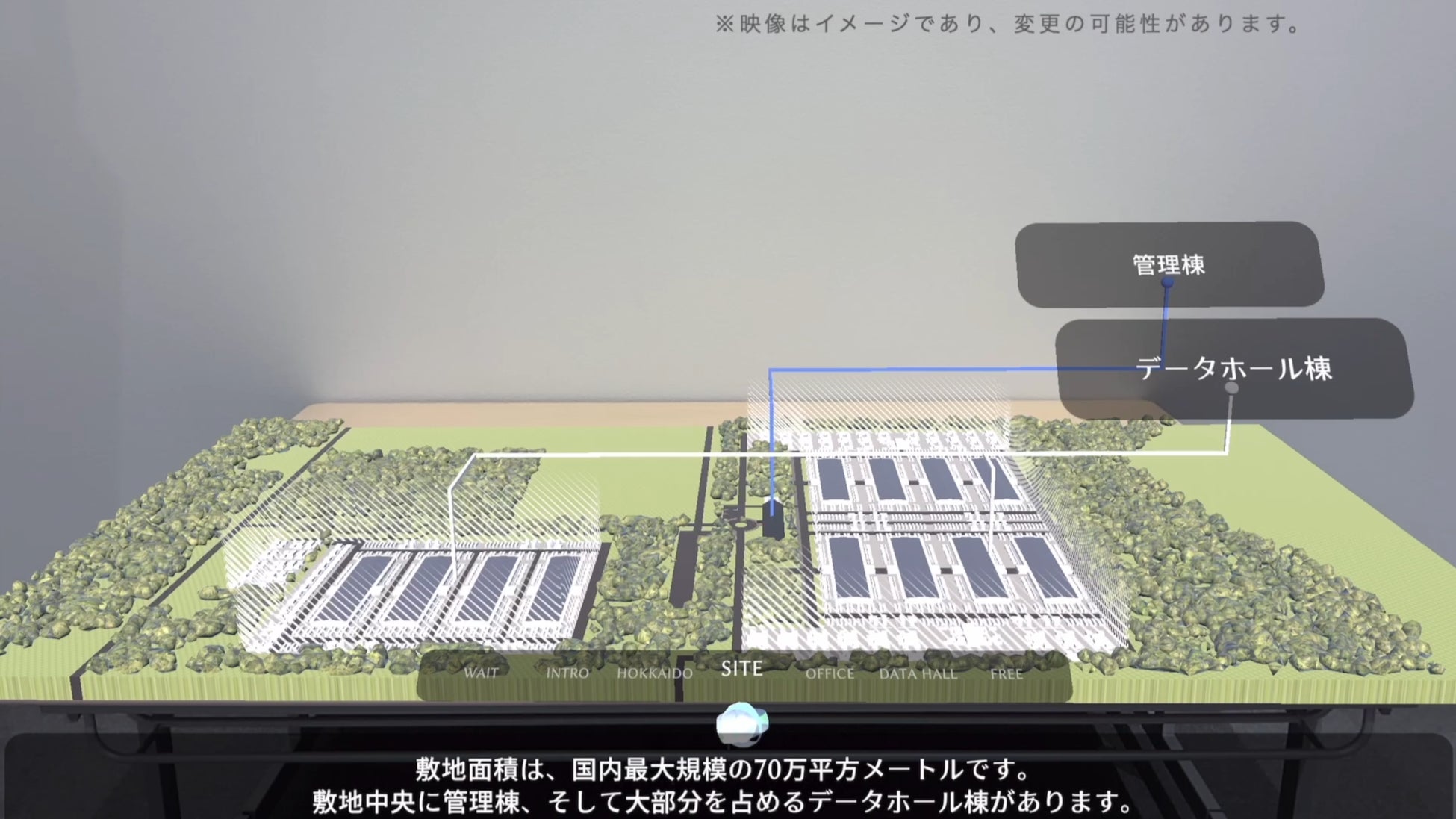 展示会場のテーブルを注視すると体験コンテンツが開始となり、テーブル上には北海道苫小牧の立地の優位さが空間的に表現され、敷地の広大さやフェーズを追って徐々に稼働するデータセンターやその見どころが展開されます。