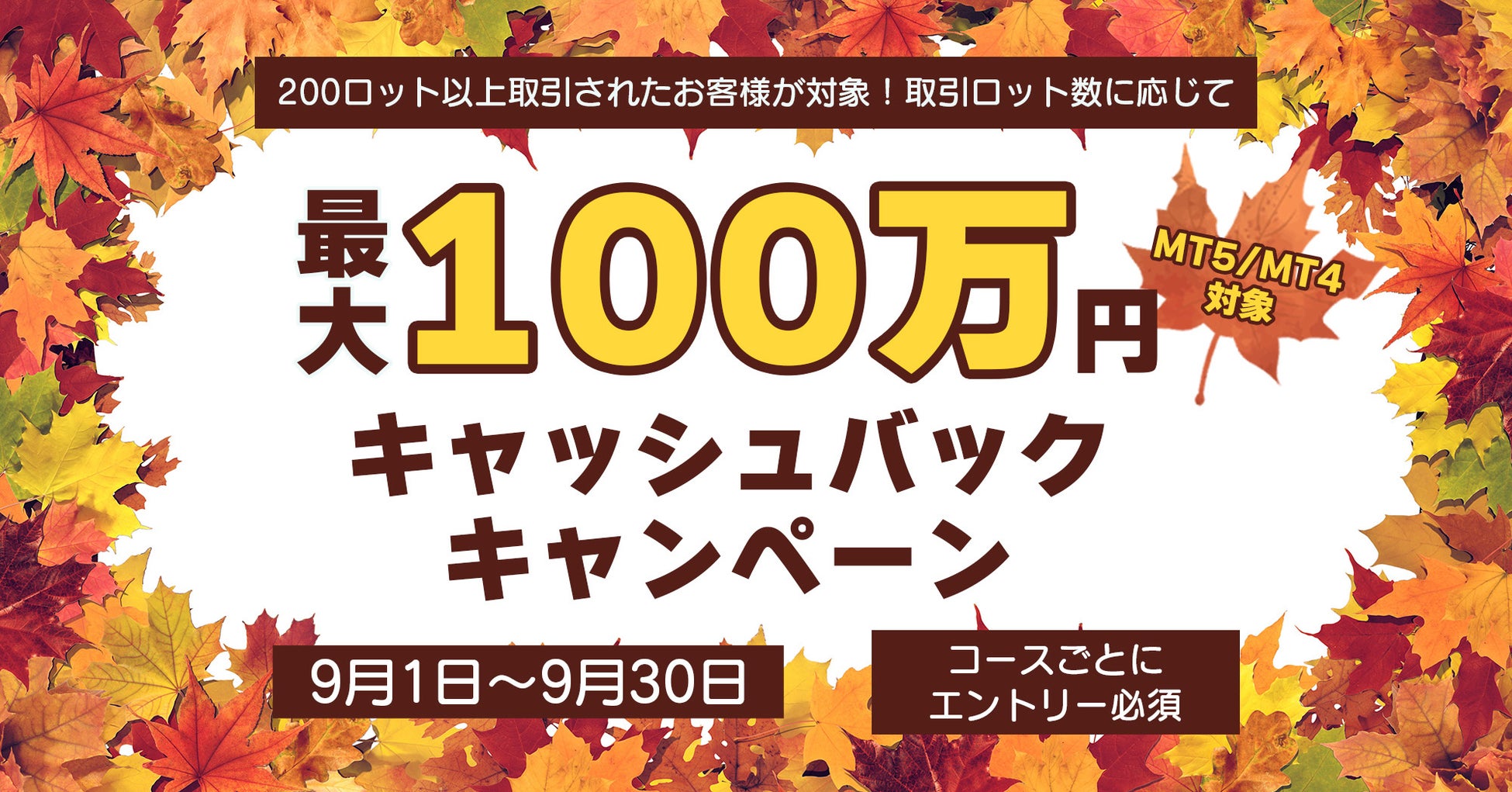 200ロット以上取引(新規+決済の合計)されたお客様に、取引ロット数に応じて最大100万円キャッシュバック!(MT5/MT4 個人・法人 各コース)