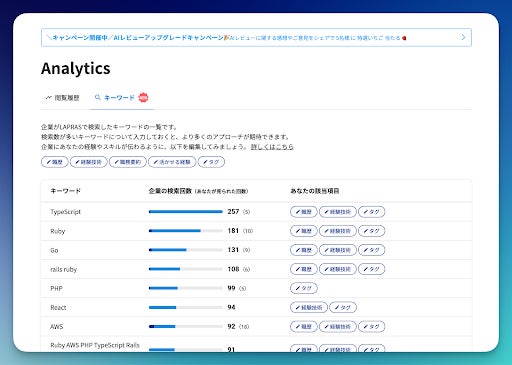 LAPRAS株式会社(所在地:東京都渋谷区、代表取締役:染谷健太郎 以下、LAPRAS)は、ハイスキルITエンジニア向け転職サービス「LAPRAS」において、Analytics機能のアップデートを実施しました。本アップデートにより、企業がどのようなキーワードで検索しているのかという市場動向を把握できるほか、自身のプロフィールがどのようなキーワードで見られているのかを確認できるようになりました。