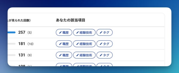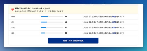 自身の職種情報(職歴、経験技術、活かせる経験スキル、タグ)に含まれていないが、関連性が高いキーワードが表示されます。この情報を活用し、プロフィールを編集することで、より多くの企業に自身の経験やスキルを伝えられます。