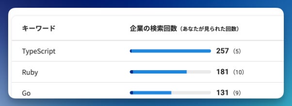 企業が検索したキーワードのうち、自身の職種と関連性の高いものが表示され、実際に自身が検索結果に表示された回数も表示されます。