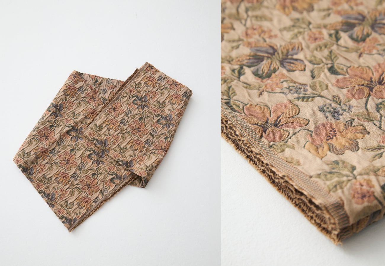 2024年4月現在までに3種類のオリジナル生地を制作しており、そのなかから今回ファブリック販売が決まったのは、ポコポコとした素材感と落ち着いたブラウンに大ぶりな花柄が特徴的な"viatic"です。