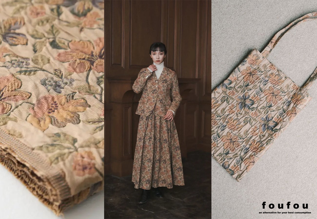 本ファブリックは、2023年3月発売の「foufou jacquard dress "viatic"(ジャカードワンピース)」を皮切りに、「foufou jacquard jacket "viatic"(ジャカードジャケット)」「foufou jacquard skirt "viatic"(ジャカードスカート)」、「original jacquard tote bag "viatic"(オリジナルジャカードトートバッグ"viatic")」と様々なアイテムに使用され人気を博しています。