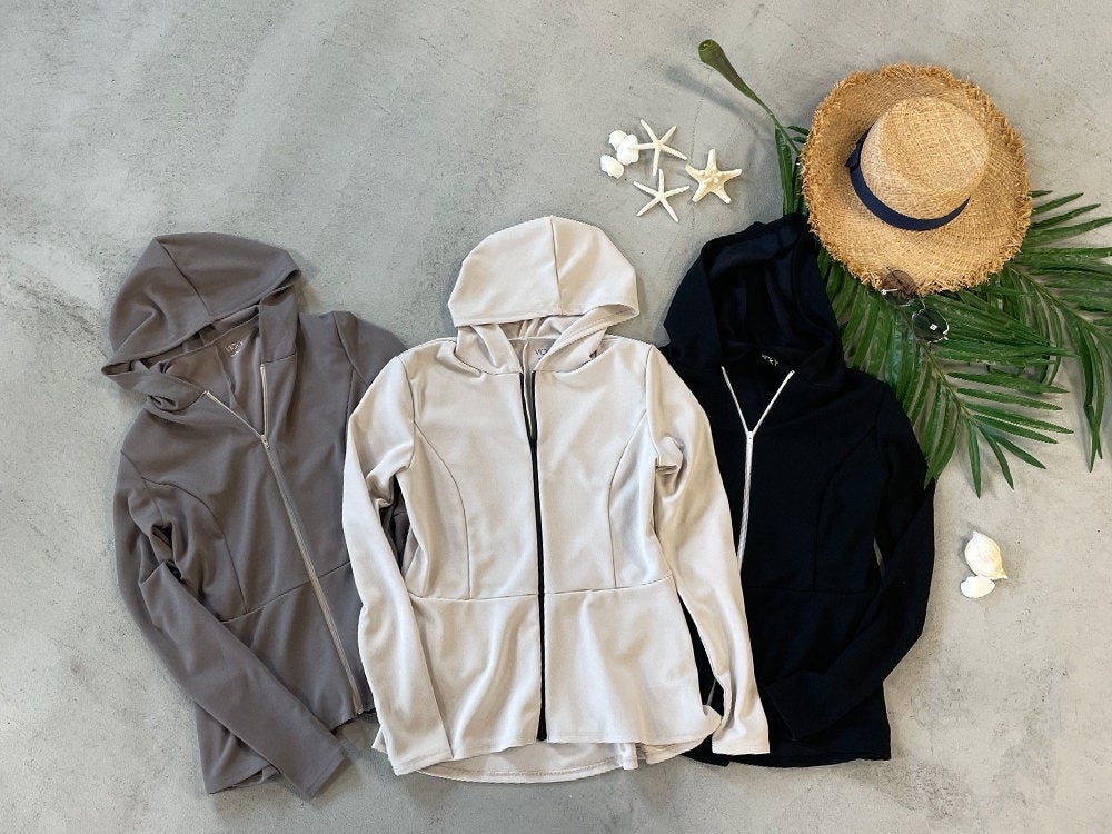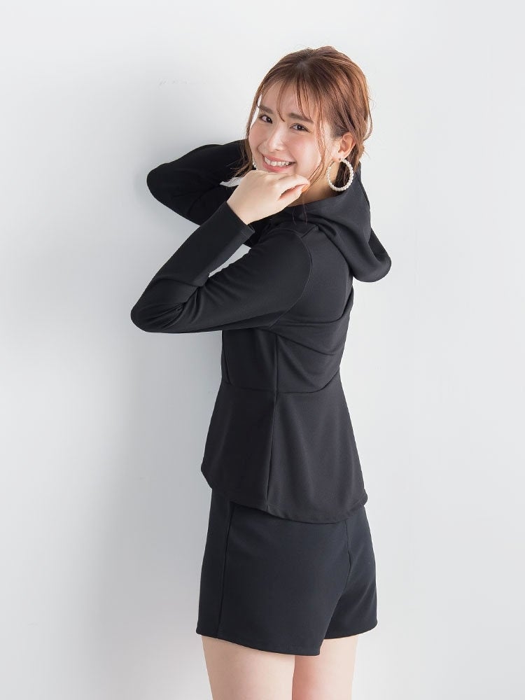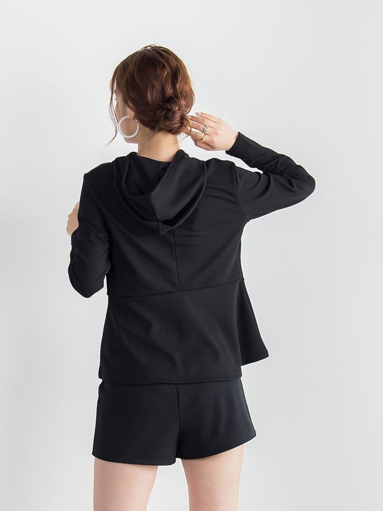 スッキリとスリムなペプラムシルエットがかわいいラッシュガードパーカー。