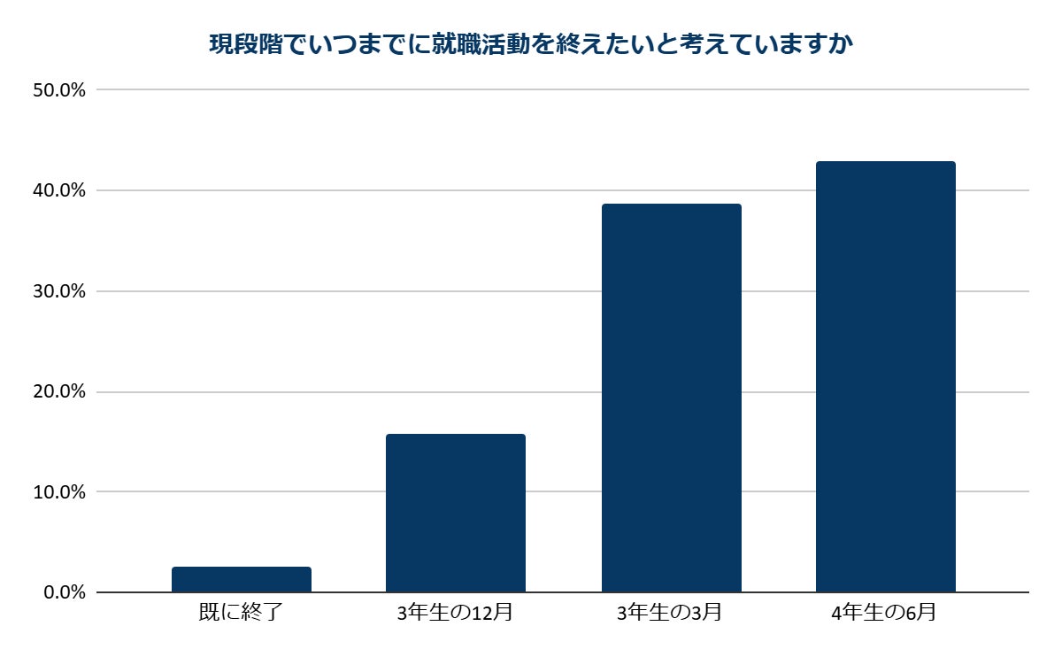 いつまでに就職活動を終えたいか、という質問には、「4年生の6月」と答えた学生が4割超となりました。サマーインターンに参加するなど早くから就活を始めている学生たちでも、政府が定めている採用選考活動のスタート時期まで就活を続ける人が多数派であることが分かります。年々進む就活の早期化・長期化を表している結果と言えるでしょう。