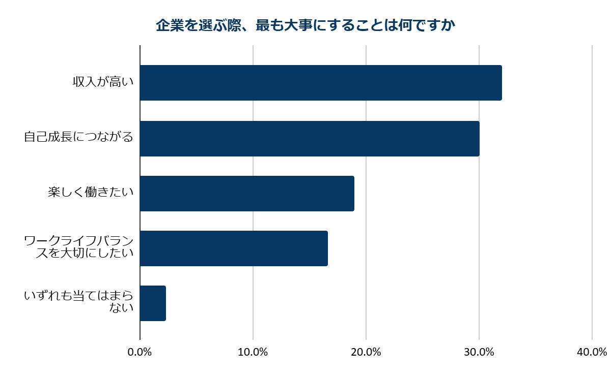企業を選ぶ際に最も大事にすることを聞いたところ、「収入が高い」ことが最も多く回答を集めました。これに「自己成長につながる」や「楽しく働きたい」が続いており、ワークライフバランスを抑えました。高い報酬を得られることや自己成長を重視する優秀層学生の価値観がうかがえます。