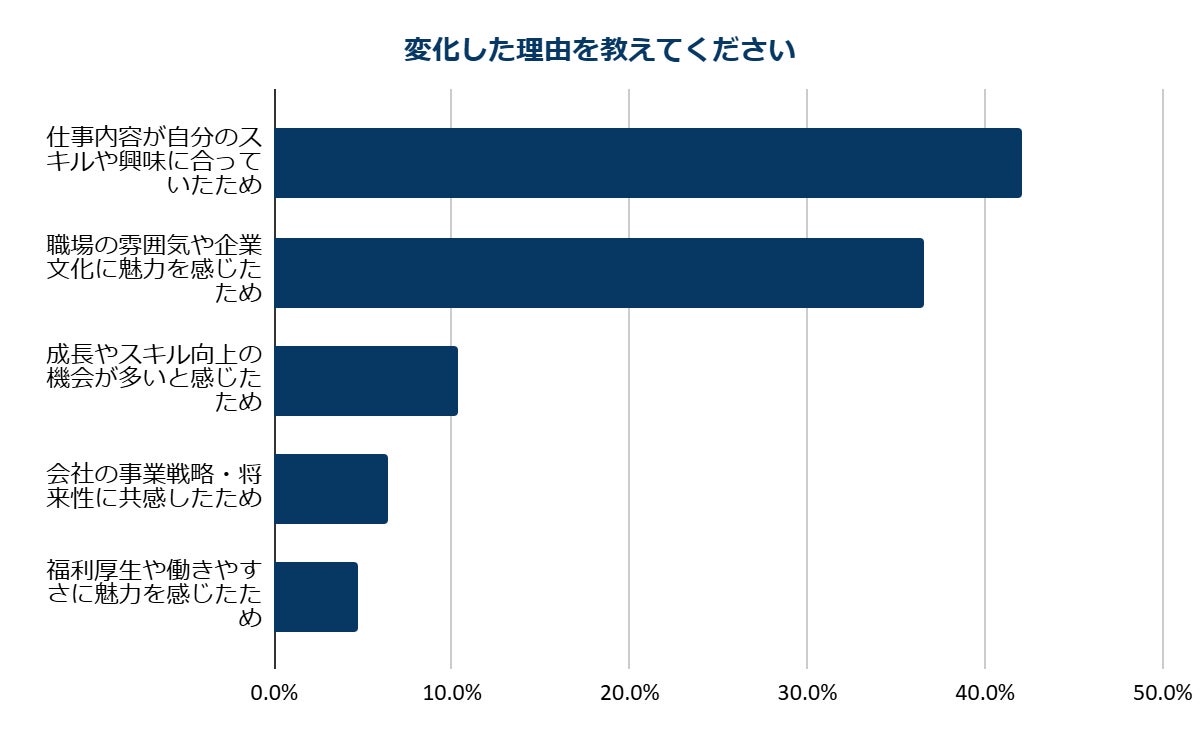 志望職種が変化した理由を聞いたところ、「仕事内容が自分のスキルや興味に合っていたため」と「職場の雰囲気や企業文化に魅力を感じたため」の二つが他を引き離して多い結果となりました。インターンを通じて自身が働くイメージや雰囲気の良さを感じ取れた場合、志望を変更する人が多いようです。