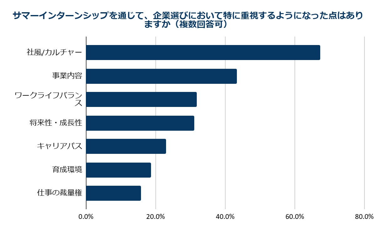 サマーインターンシップを通じて企業選びで特に重視するようになった点を聞いたところ、「社風/カルチャー」がトップで、次いで「事業内容」となっています。