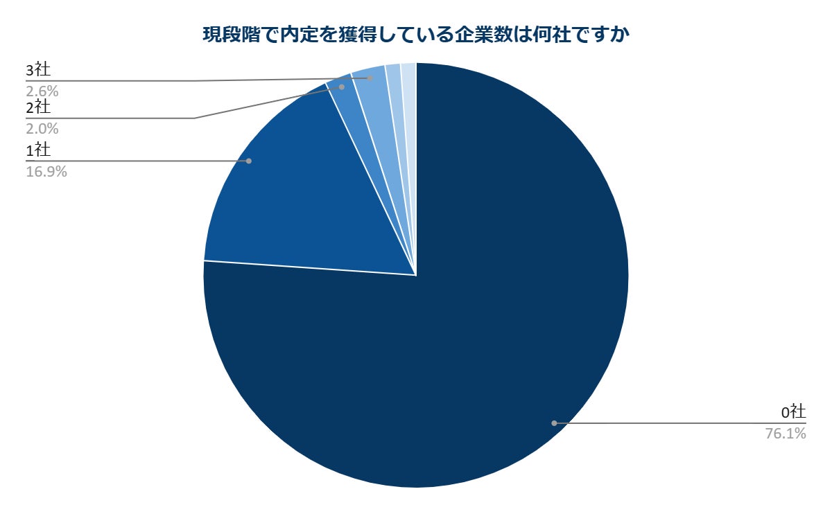 調査時点で全体の76.1%の学生は内定を獲得していませんでしたが、16.9%がすでに1社から内定を獲得していることも判明しました。サマーインターン経由で早期に内定を出すコンサルティングファームが影響していると言えます。