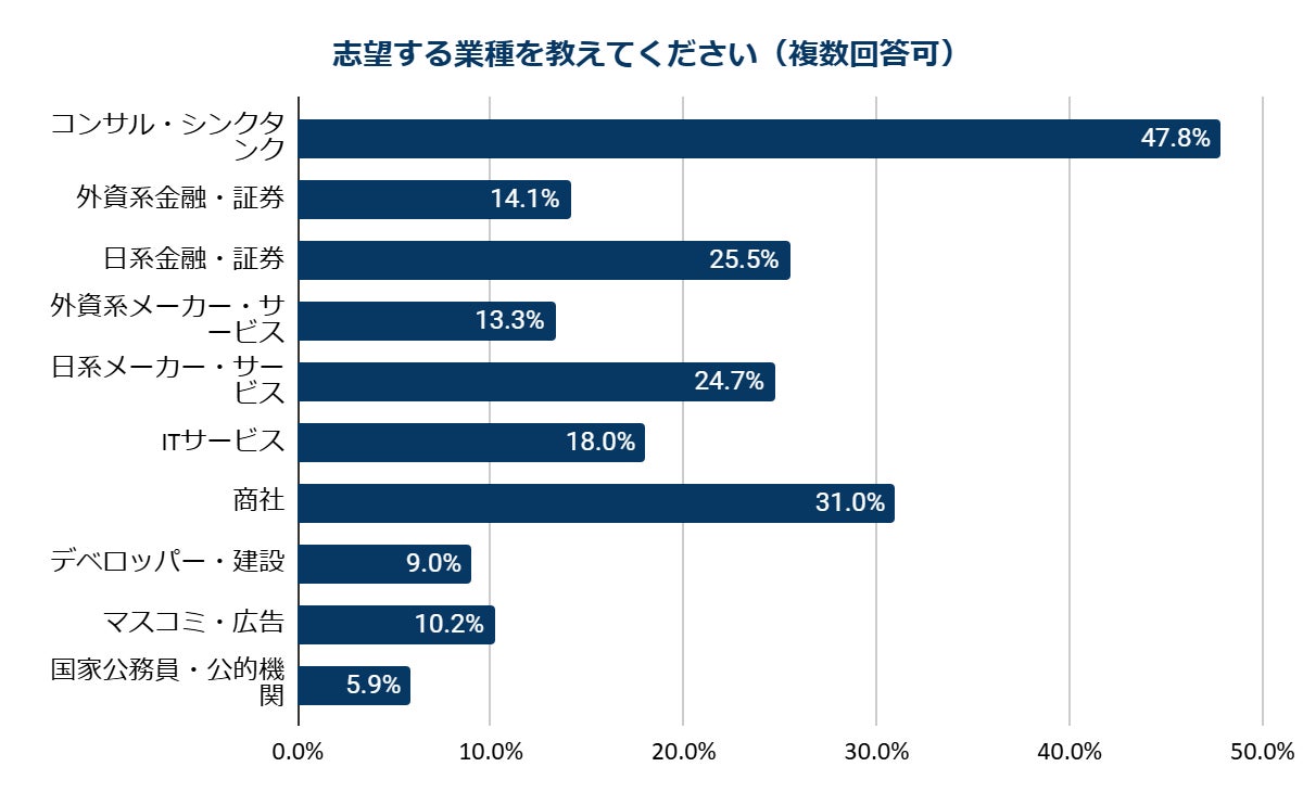 志望業種は、「コンサル・シンクタンク業界」がトップでした。早い内から経験をつめることや年収帯が高いことなどから、優秀層大学生からの人気は定着しています。一方、2位以下は「商社」「日経金融・証券」「日系メーカー・サービス」と続いており、日系企業の志望度も高まっていることが特徴です。日系企業はコンサルや外資系企業に比べて選考時期が遅い傾向にあります。4割超の学生が大学4年生の6月まで就活を続けると回答した結果と合致します。