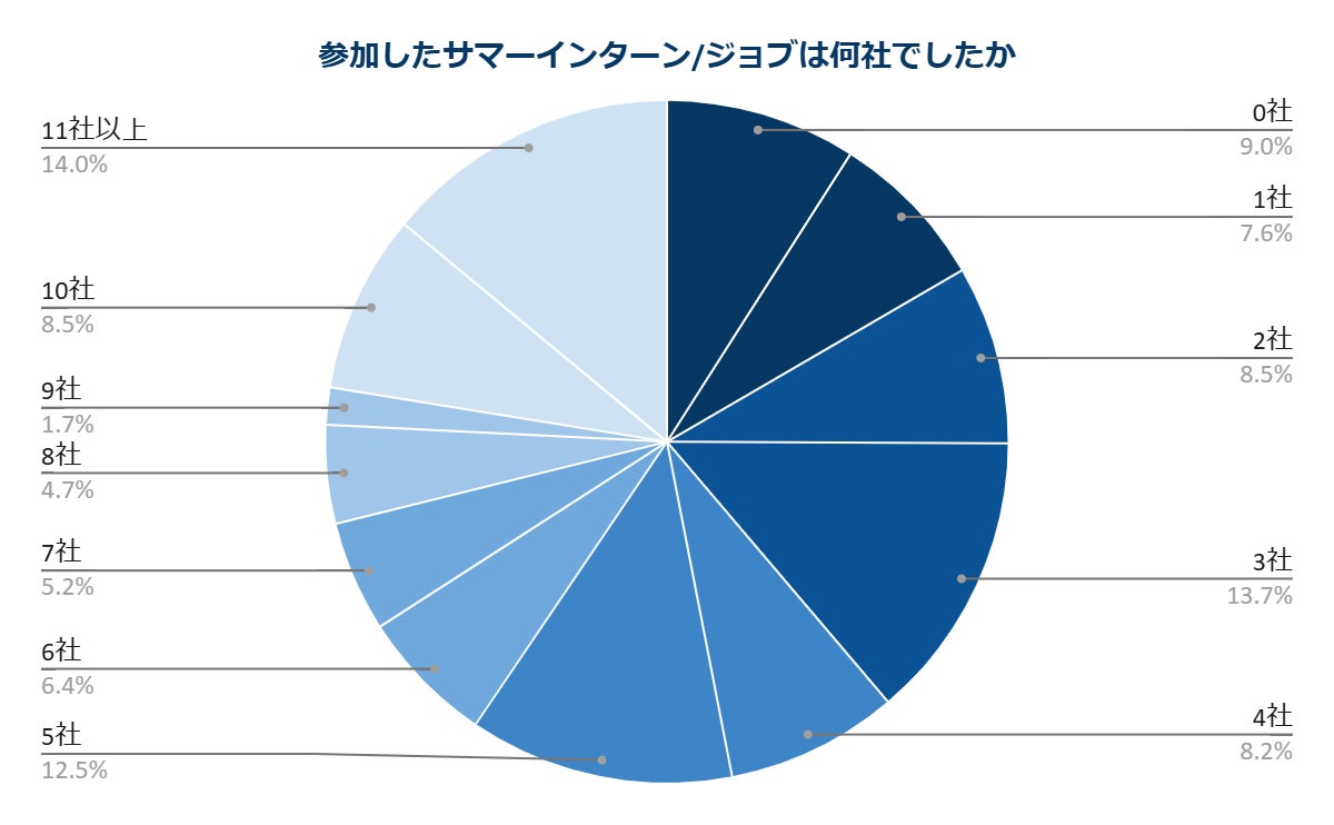 コンサル業界や外資系企業を志望するにあたって、もはや「本選考」の一部となっているサマーインターンシップ。サマーインターンに参加した社数を聞いたところ、11社以上に参加した人が14%と一番多い回答となりました。2番目に多かったのは3社で13.7%。0社だった人は9%にとどまり、複数社のサマーインターンに参加する学生が圧倒的に多数派であることが分かります。