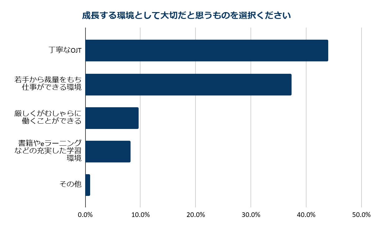 成長する環境として学生が大切するものとしては、「丁寧なOJT」と「若手から裁量をもち仕事ができる環境」がともに4割近くを占めました。優秀層の学生は「自分の市場価値を上げたい」「若いうちからチャレンジしたい」という志向性を持っており、それが叶う環境を選ぶ傾向にあります。
