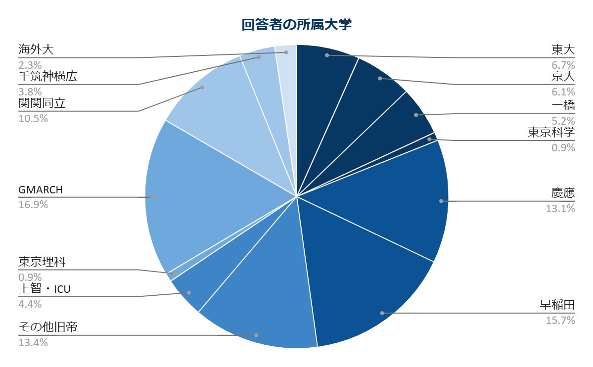 回答者の約50%は東京大学・京都大学・早稲田大学・慶應大学・一橋大学・東京科学大学のいわゆる上位校学生が占め、旧帝大全体やGMARCHも含めると80%超となります。