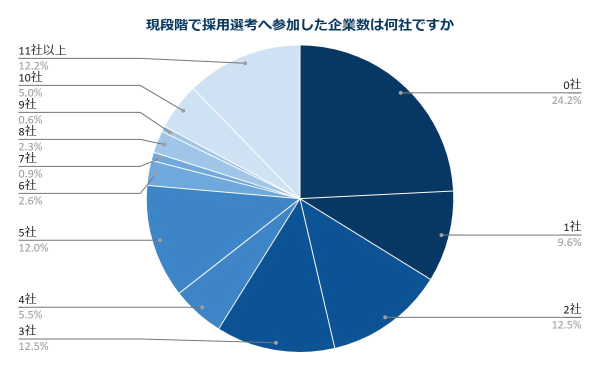外資就活ドットコム会員から人気のあるコンサル業界や外資系企業では、サマーインターンを通して本選考を行う企業が珍しくありません。サマーインターン参加後の本選考の参加社数を聞いたところ、0社が24.2%と一番多い回答となりましたが、11社以上の人も12.2%おり、選考に進む学生の方が多い結果となっています。