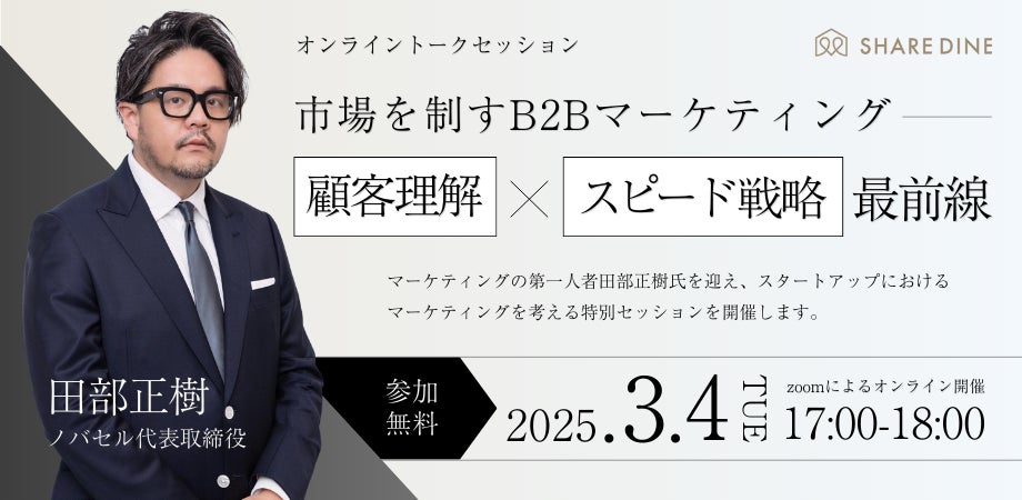 日本発、料理人のためのグローバルキャリアプラットフォームを運営する株式会社シェアダイン(本社:東京都港区、代表取締役:飯田 陽狩、以下「シェアダイン」)は、ノバセル株式会社 代表取締役社長 / ラクスル株式会社 取締役CMOの田部正樹氏がアドバイザーに就任したことをお知らせいたします。また田部氏をゲストスピーカーに迎え、オンラインイベント「市場を制すB2Bマーケティング―顧客理解×スピード戦略の最前線」を2025年3月4日(火)に開催します。