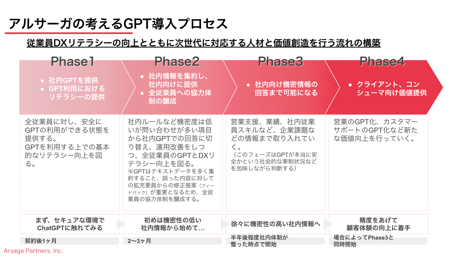 GPT導入プロセスとして、まずは全従業員に対しセキュアな環境でGPTを利用し、運用改善を繰り返すことで社内でGPTを理解し育てるフェーズが必要です。社内活用を通じて、従業員のDXリテラシーの向上とともに、将来的には収集した情報を活用し、社内情報だけでなくクライアントやコンシューマにも展開することが容易になります。