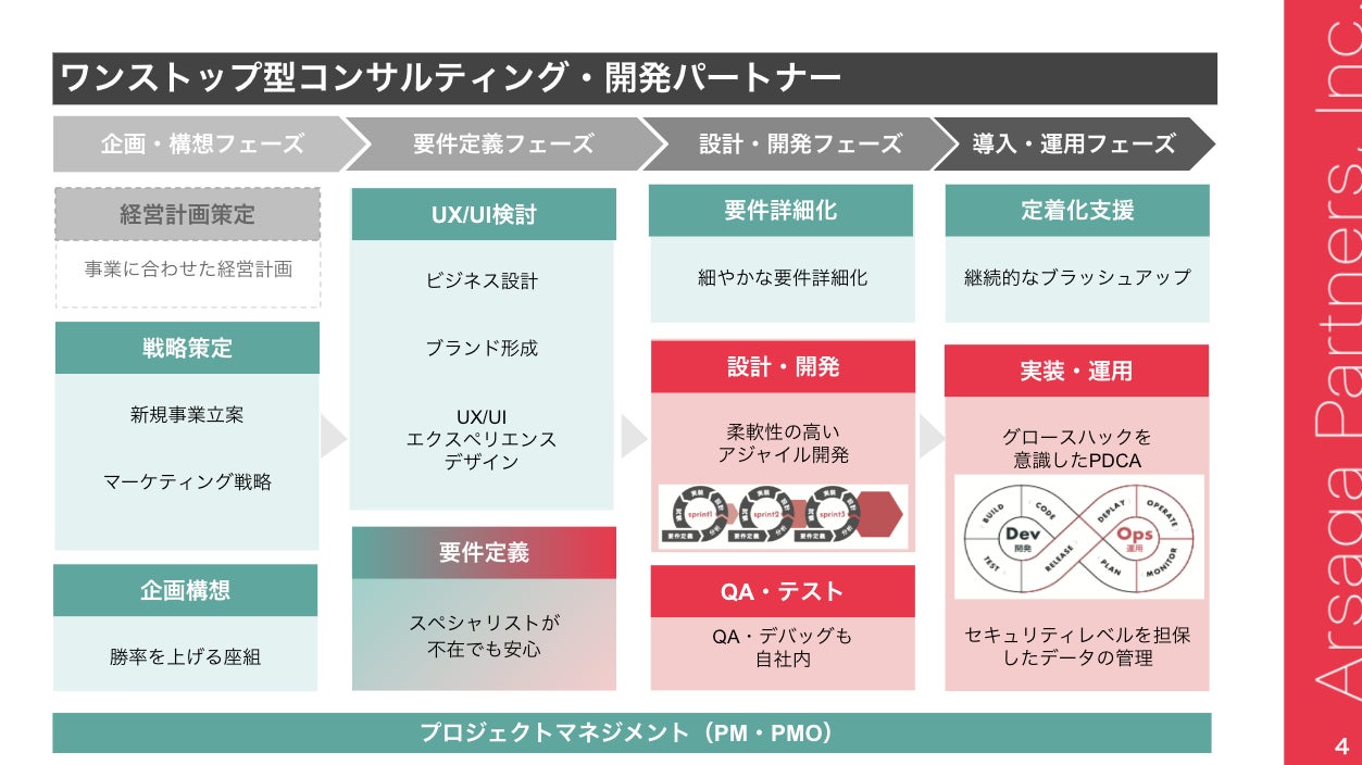 アルサーガパートナーズは、「人をつくる、だからモノをつくれる」をビジョンに掲げ、日本全国のDX事業の成功をミッションとするワンストップ型のDXコンサルティング・開発パートナーです。自社内にコンサルティング・企画・デザイン・IT開発・保守運用まで、ITシステムの開発と運用に必要なすべての機能を包括しています。エンジニアが社員の8割を占める組織構成で、ユーザー企業と直接取引を行い、自社内開発をモットーとしており、適正なコストでのサービス提供を実現しています。「最高品質を最速で」をスローガンに、お客さまに寄り添うことでビジネスの成功をより確実なものへと導きます。