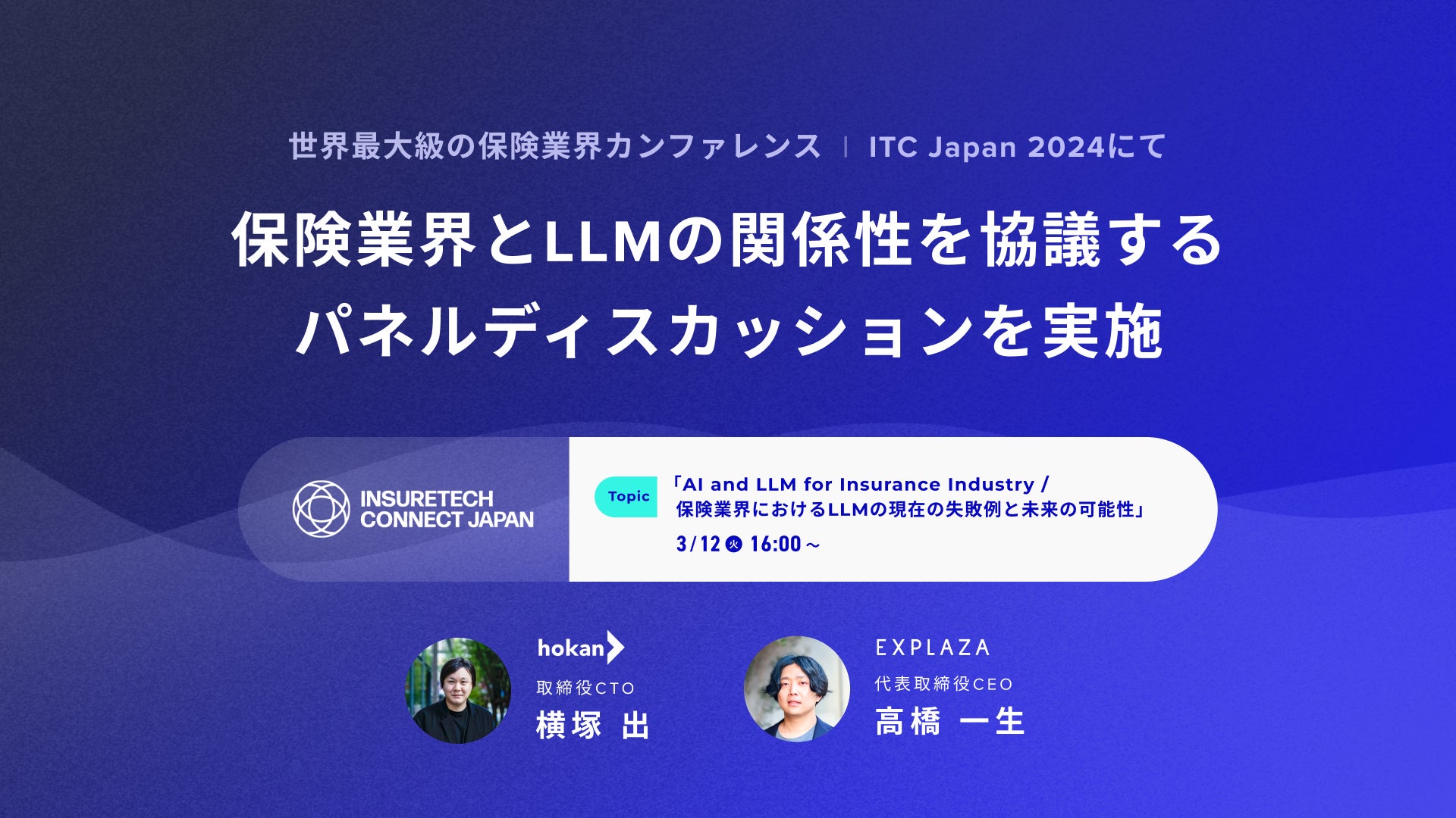 ITC Japan 2024にて、当社とエクスプラザを含む4社合同での登壇を予定しております。保険業界とLLMの関連性を協議するパネルディスカッションを実施いたします。