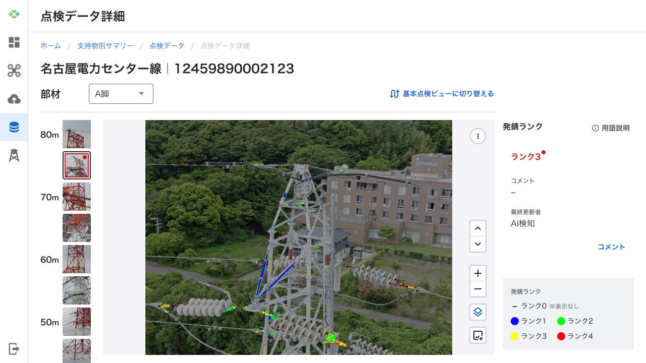 「鉄塔錆」検出については、錆の度合いに応じたランク分類も可能です。