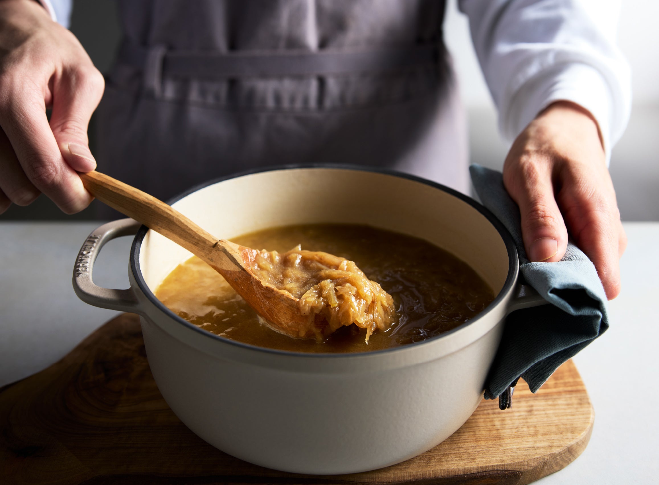 バーミキュラの無水調理で玉ねぎの甘みを際立たせ、焦がしバターの香りとコクが広がる一杯。パンと合わせても格別です。