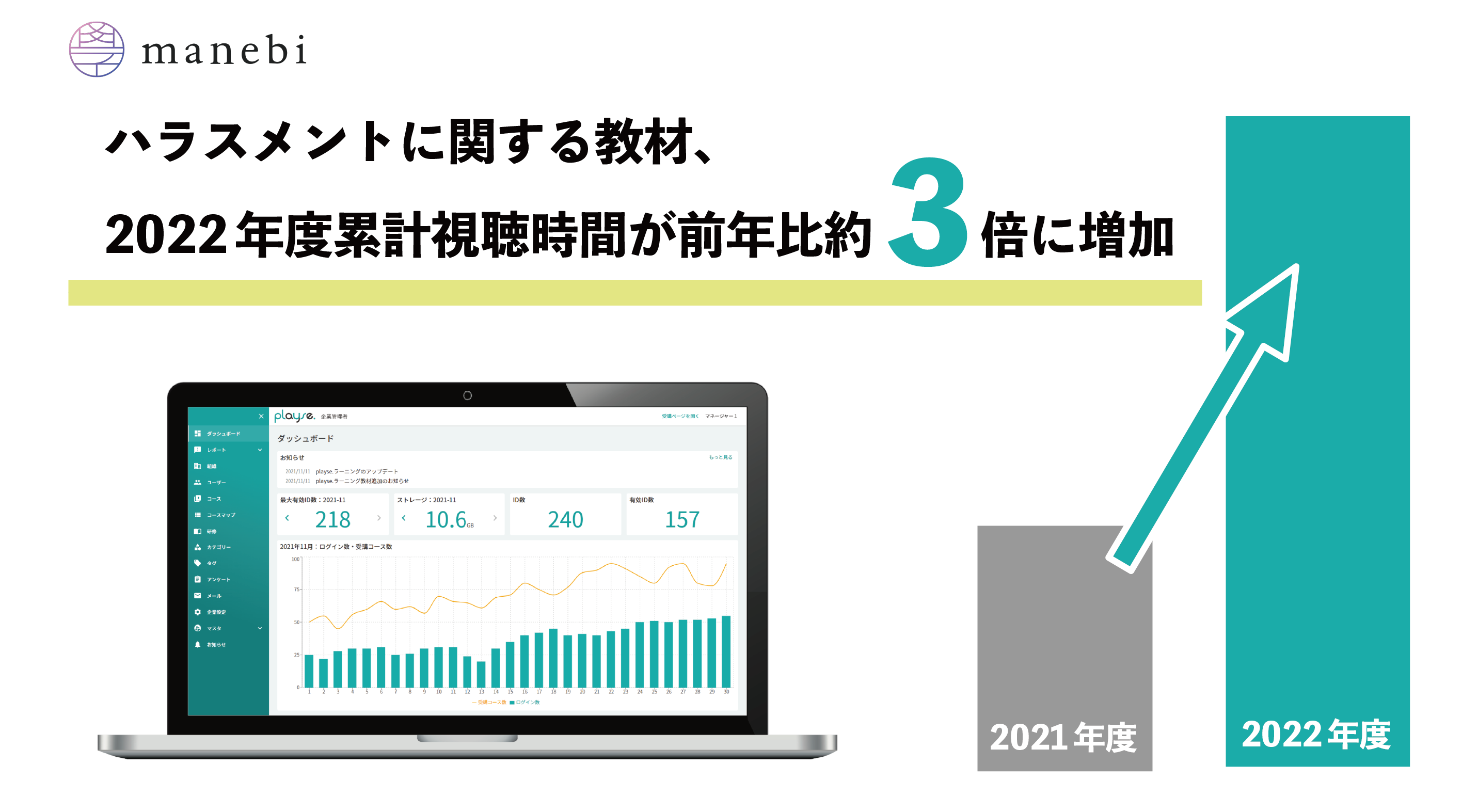 2022年度のハラスメントに関する教材の累計視聴時間は、前年比約3倍に増加