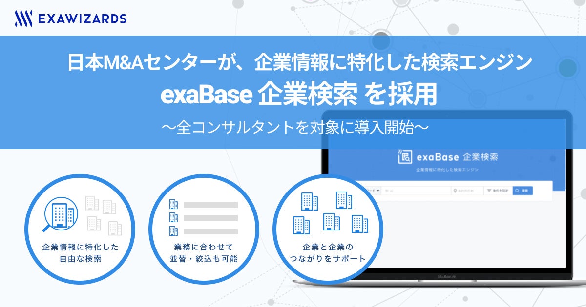 AIを利活用したサービスによる社会課題解決に取り組む株式会社エクサウィザーズ(東京都港区、代表取締役社長:石山 洸、以下「エクサウィザーズ」)は、株式会社日本M&Aセンター(以下、「日本M&Aセンター」)に、企業情報に特化した検索エンジン「exaBase 企業検索」の提供を開始しました。