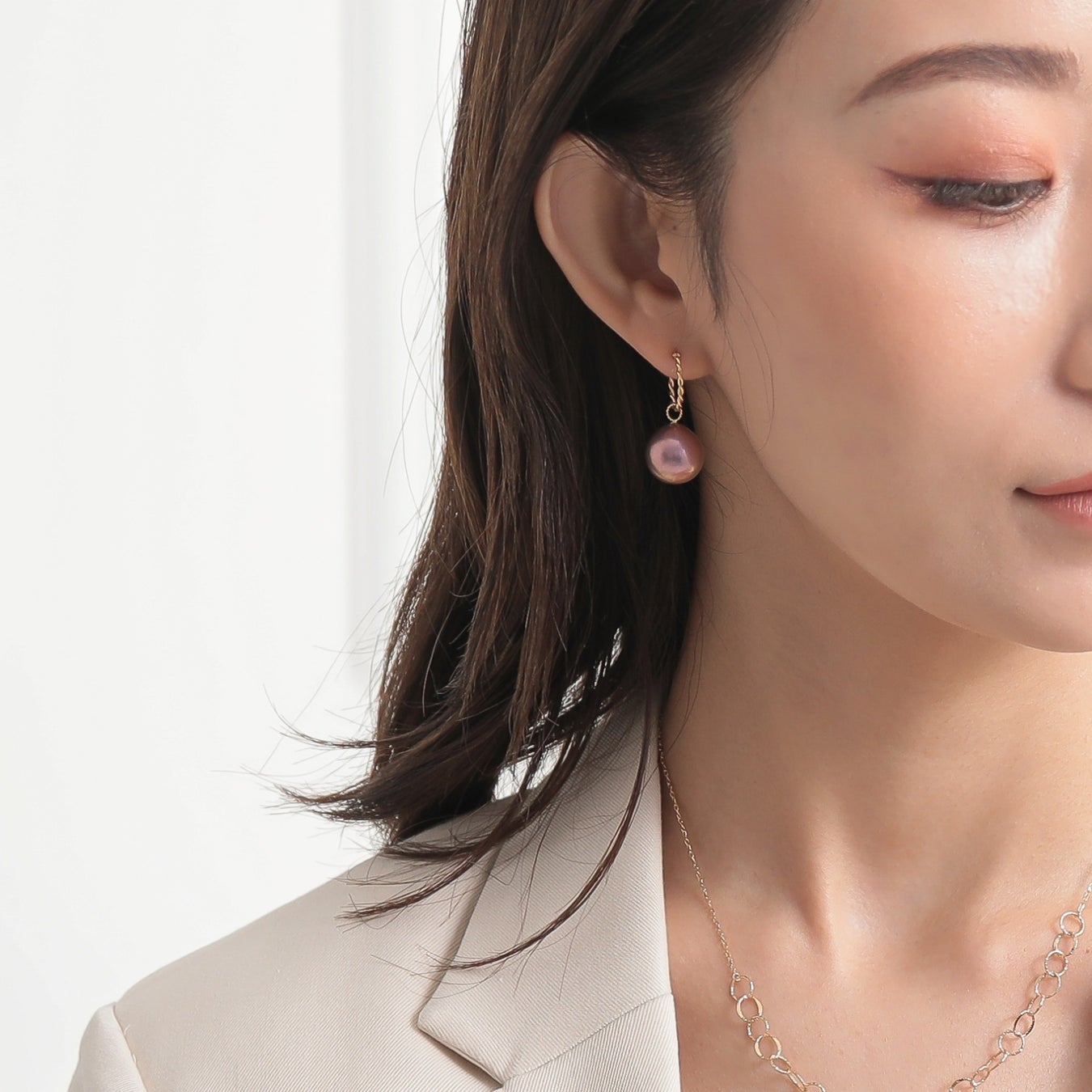 艶やかな大粒ピンクパールのフープデザインピアス。