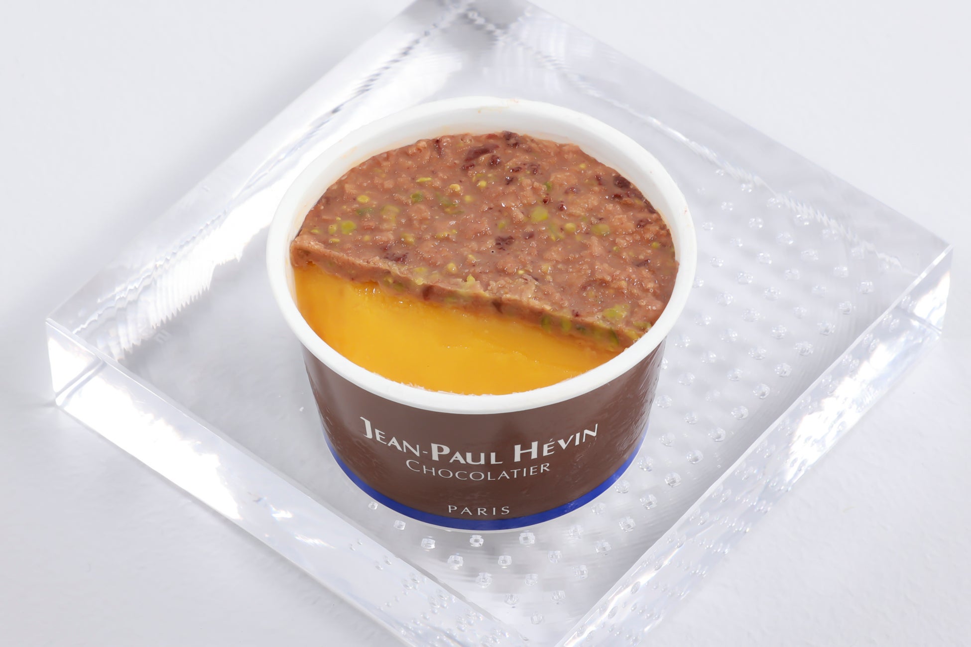 キャラメル風味のミルクチョコレートにピスタチオを合せたサクサクとした食感のクルスティヤン、マンゴーパッションソルベの組合せ。