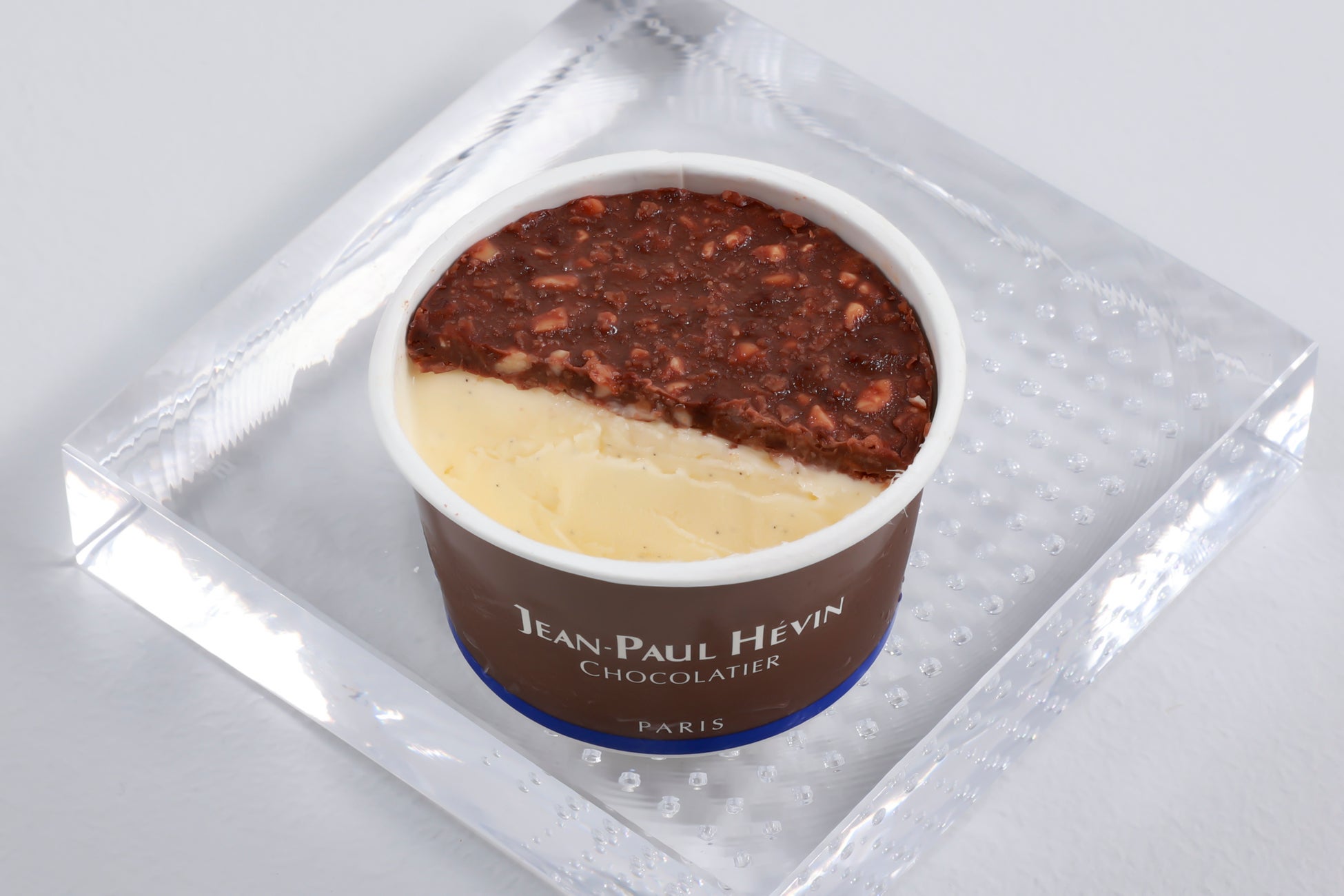 ビターとミルクのチョコレートにアーモンドを合せたサクサクとした食感のクルスティヤン、ヴァニラをたっぷりと使用したアイスの組合せ。