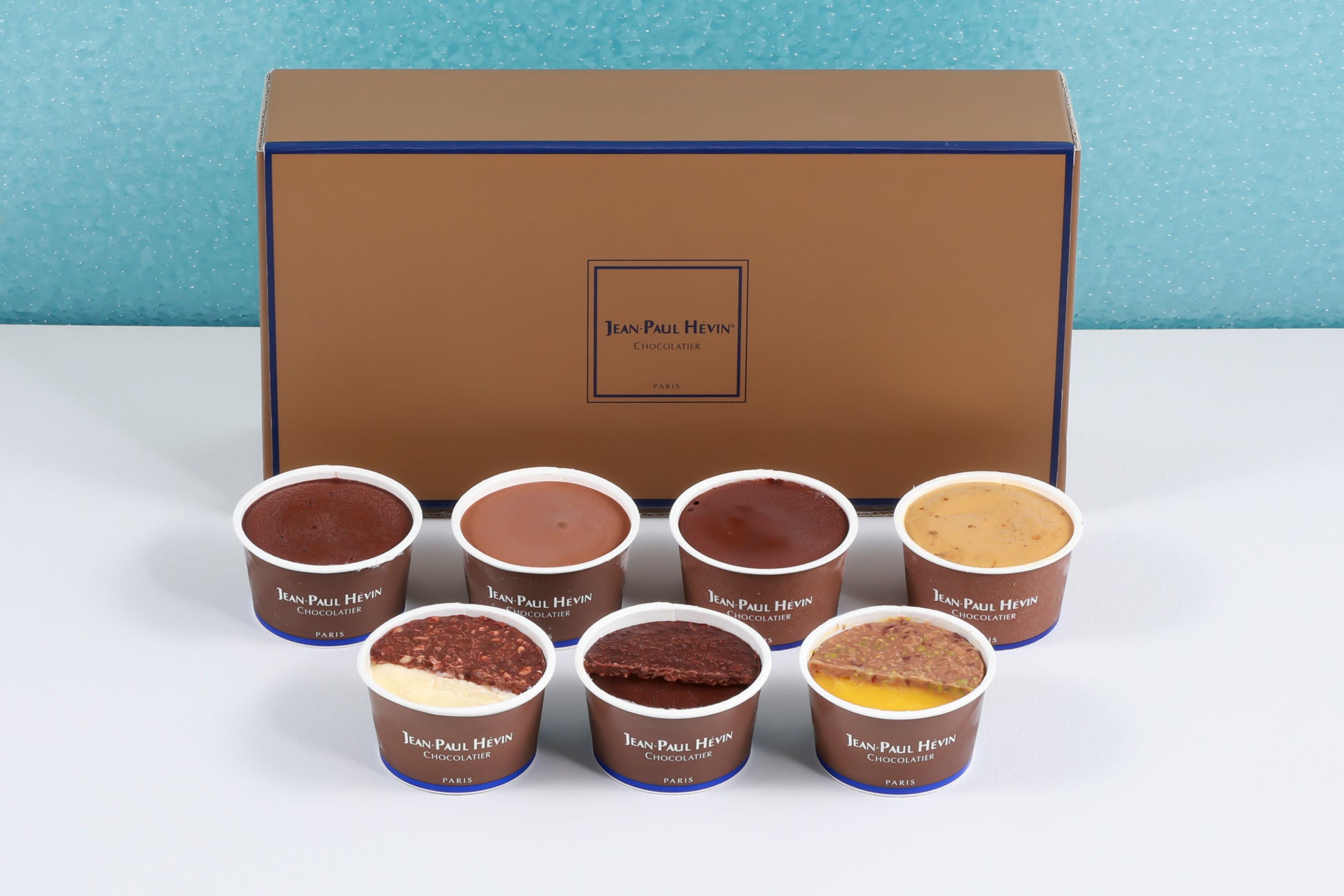 チョコレートとカカオニブやナッツのサクサクとした食感が愉しめるクルスティヤンを合せた新作ソルベとアイス3種、定番人気のアイス4種の詰合せ。