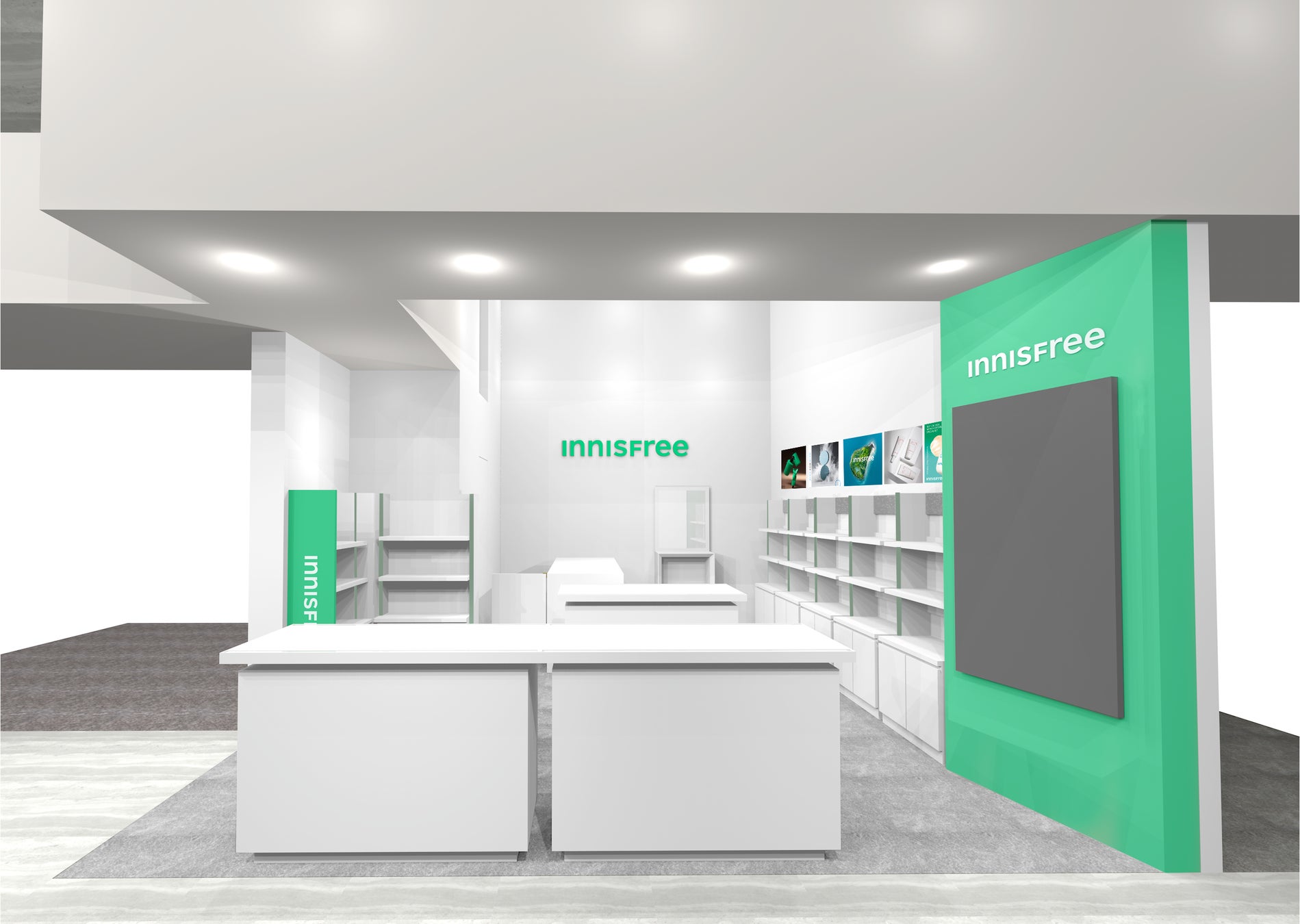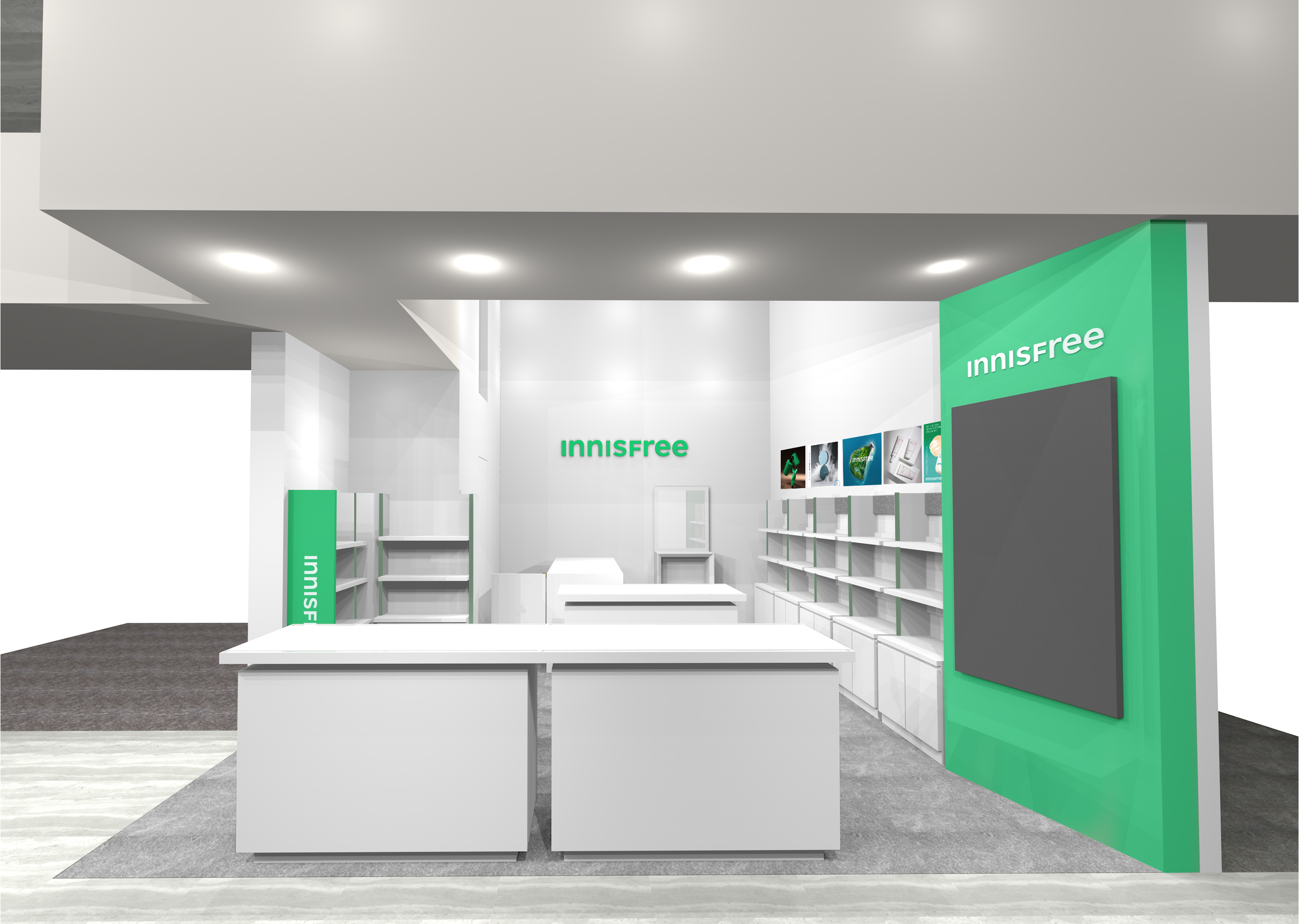 パワフルな⾃然の恵みと研究技術⼒よる機能性をインスピレーションし、ブランドのキーカラー[グリーン]をアクセントにした、これまでとは⼀変した新しい店舗デザインです。