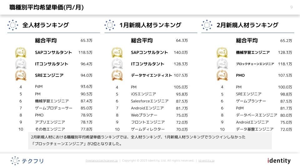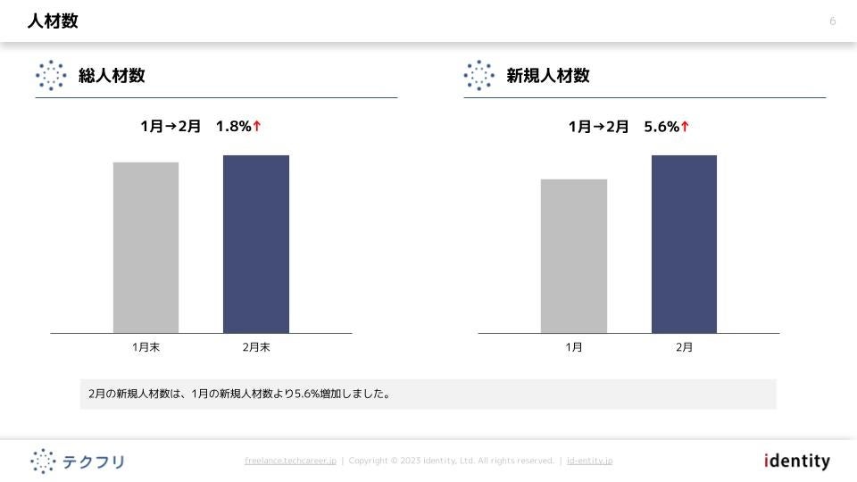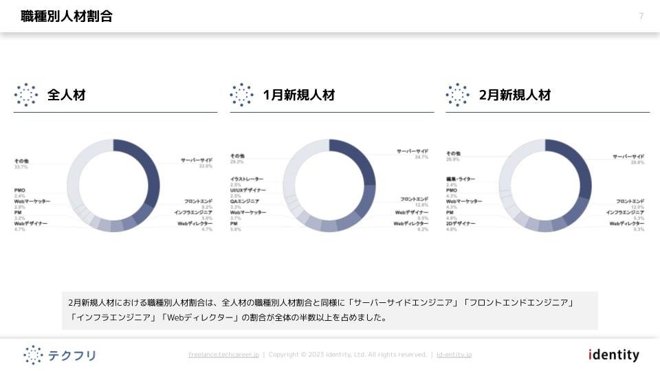 ITフリーランスエンジニアの案件・求人サイト「テクフリ」(https://freelance.techcareer.jp/)を運営する株式会社アイデンティティー(東京都新宿区、代表取締役:今野 力、以下「当社」)は、テクフリのデータベースをもとに2023年2月における人材の市況感を調査しました。より詳しい結果については、お問い合わせから資料請求が可能です。