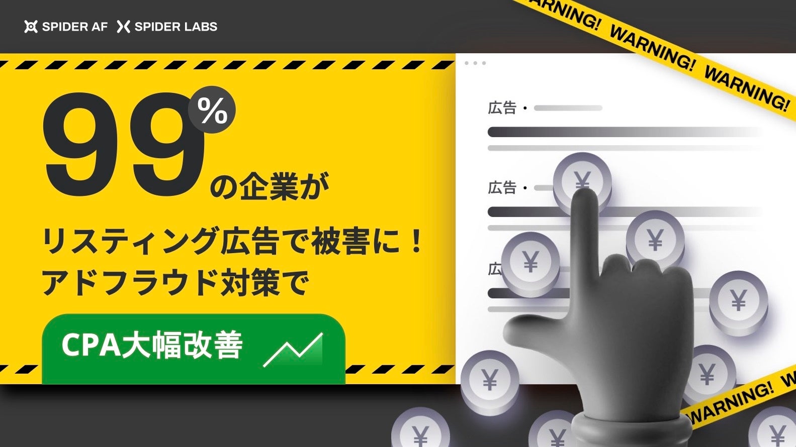 アドフラウド(広告不正)対策ツール「Spider AF(スパイダーエーエフ 以下「Spider AF」)」を提供する株式会社Spider Labs(東京都港区、代表取締役社長:大月 聡子、スパイダーラボズ 以下「Spider Labs」)は、リスティング広告を出稿している事業者向けにお役立ち資料「99%の企業がリスティング広告で被害に!アドフラウド対策でCPA大幅改善」を公開しました。無料でダウンロードできるお役立ち資料となっておりますので、インターネット広告に携わる方はぜひご一読ください。