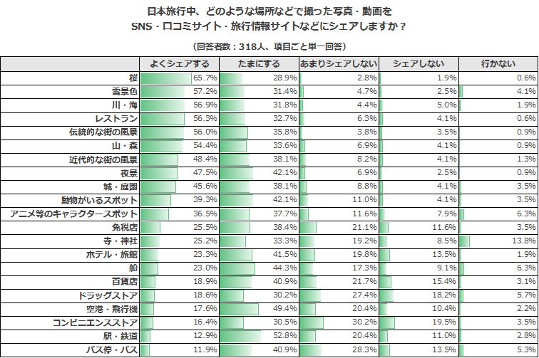 SNS等にシェアする撮影スポットに関しては、やはり日本を象徴する景色とも言える「桜」が人気で、「よくシェアする」と回答した人は3人に2人(65.7%:209人)にのぼり、「たまにシェアする」(28.9%:92人)とあわせると、全体の94.6%:301人になりました。次に「よくシェアする」が多かったのが「雪景色」、「川・海」で、日本の自然にまつわるスポットが上位に並びました。