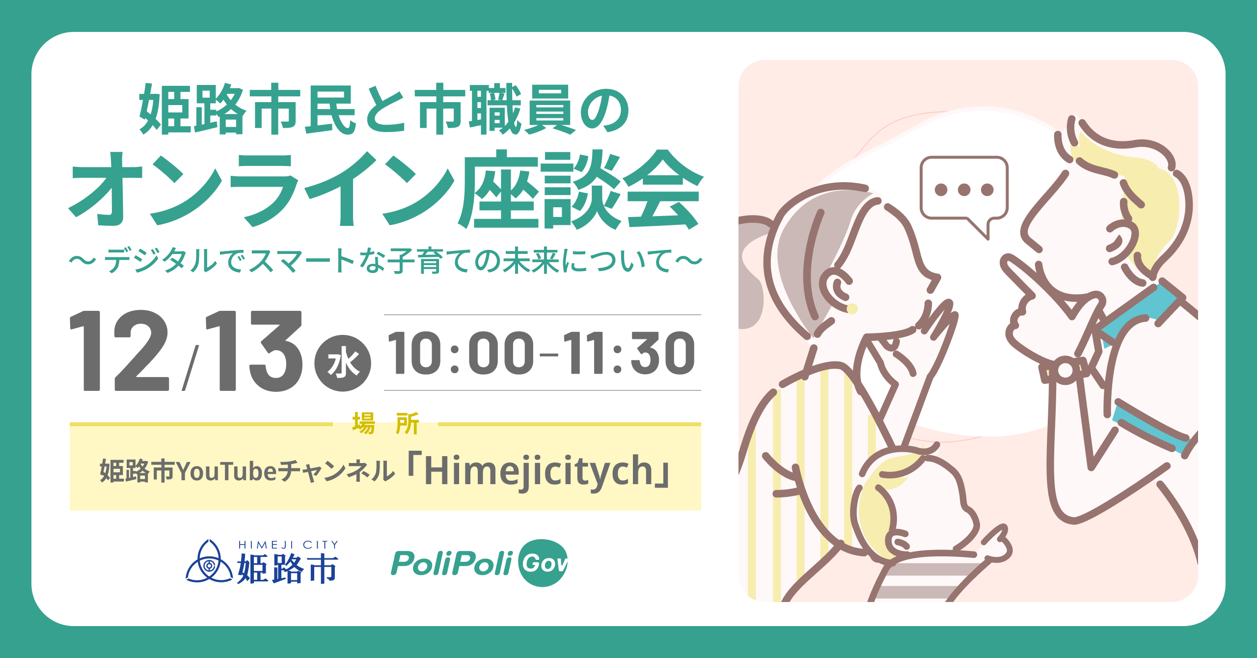 株式会社PoliPoli(所在地:東京都千代田区、代表取締役:伊藤和真、以下 PoliPoli)は、姫路市の、行政に声を届けるウェブサイト『PoliPoli Gov』の利用を受けて、姫路市民と市職員による、姫路市の子育て支援サービスの未来について語る座談会を実施し、座談会の様子をYouTubeでライブ配信を実施することをお知らせいたします。