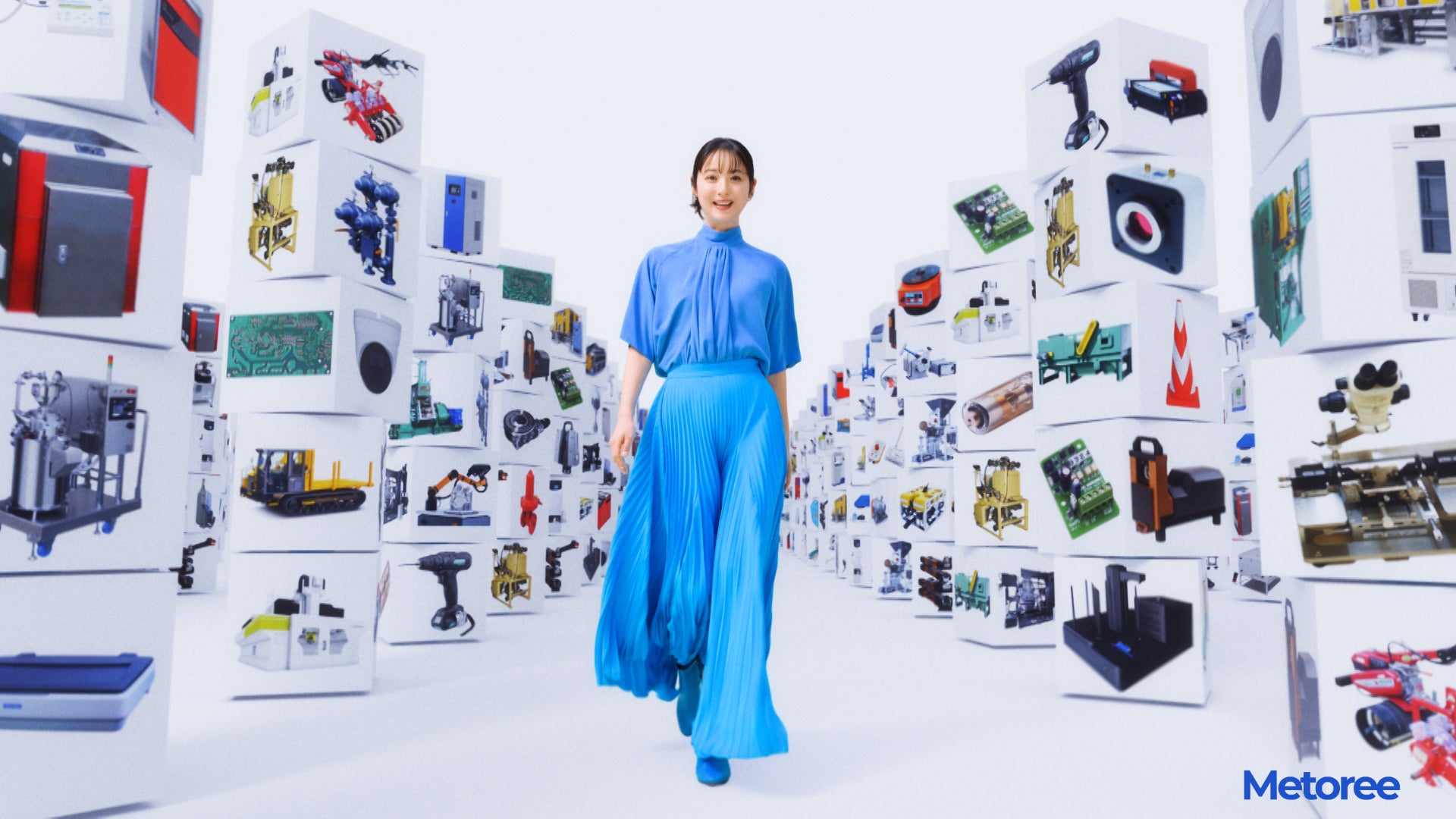 今回の新CMでは「産業用製品探すならメトリー」というメッセージを、佐々木希さんの華やかな存在感とテンポ感のある音楽で届けます。メトリーのブランドカラーであるブルーの衣装に身を包んだ佐々木希さんが、ランウェイを歩くように次々とポーズを決めながら「産業系!」とチャーミングにアピール。工作機械やセンサー等が並ぶ画面を背景に、佐々木希さんがスタイリッシュに歩くという、「BtoB×ファッションショー」の異色の組み合わせが最大の見どころです。