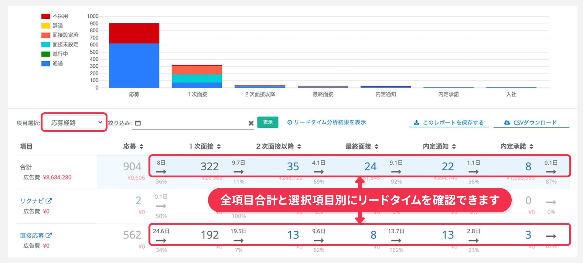 各採用ステップ間のリードタイムを可視化することで、採用プロセスのボトルネックや効率化の機会を特定し、集中して改善することで、より迅速で効果的な採用活動を実現することができます。