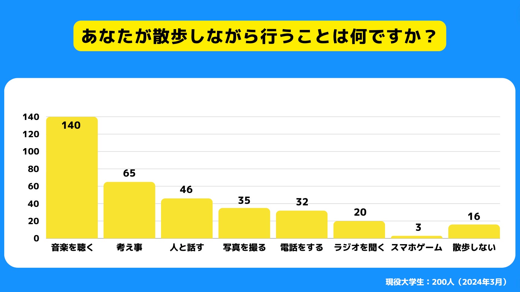 最も多かった回答は「音楽を聴く」で大学生の7割でした。続いて「考え事」、「人と話す」などの回答がありました。