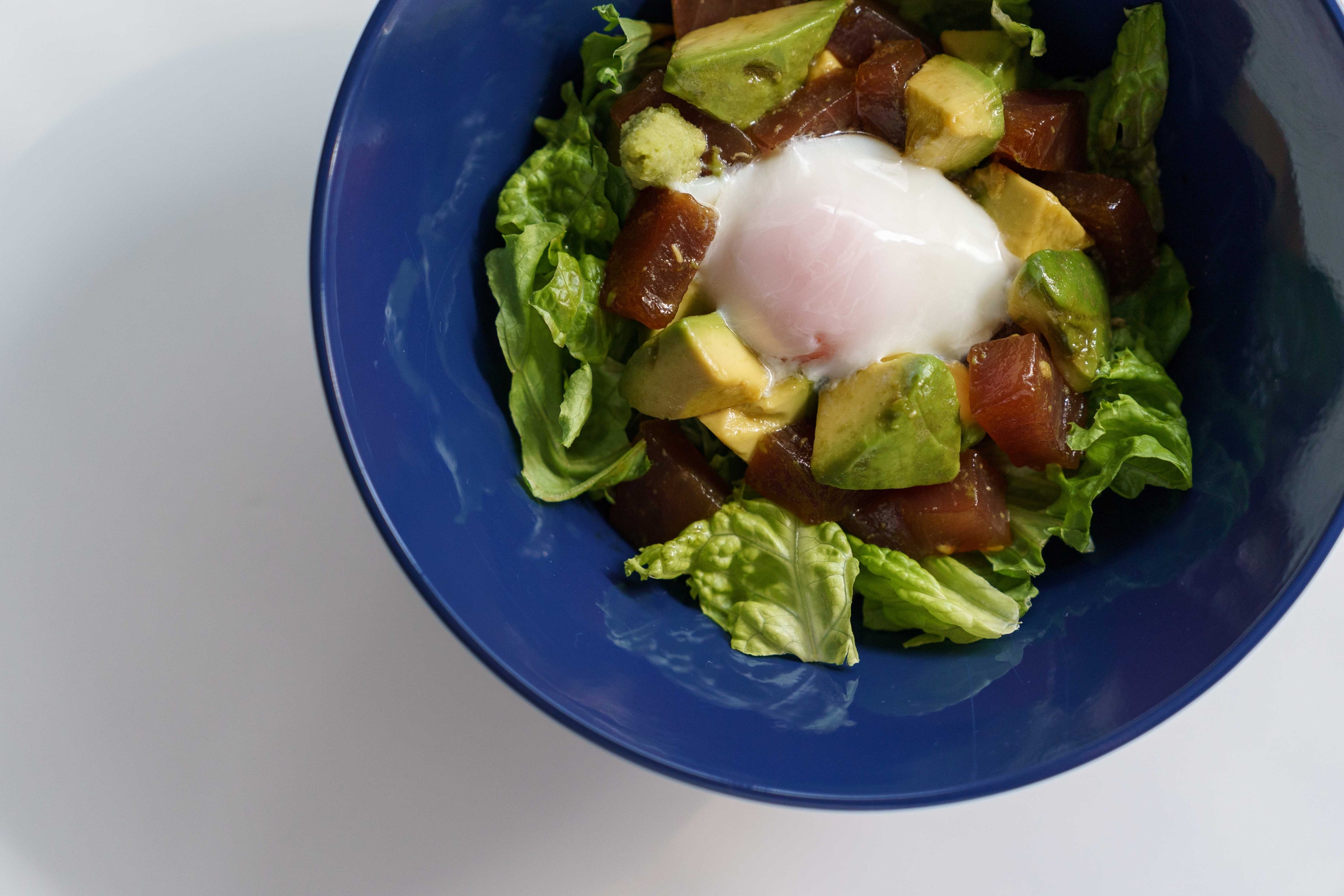醤油・味醂・胡麻油で和えたマグロとアボカドをご飯に乗せた丼。