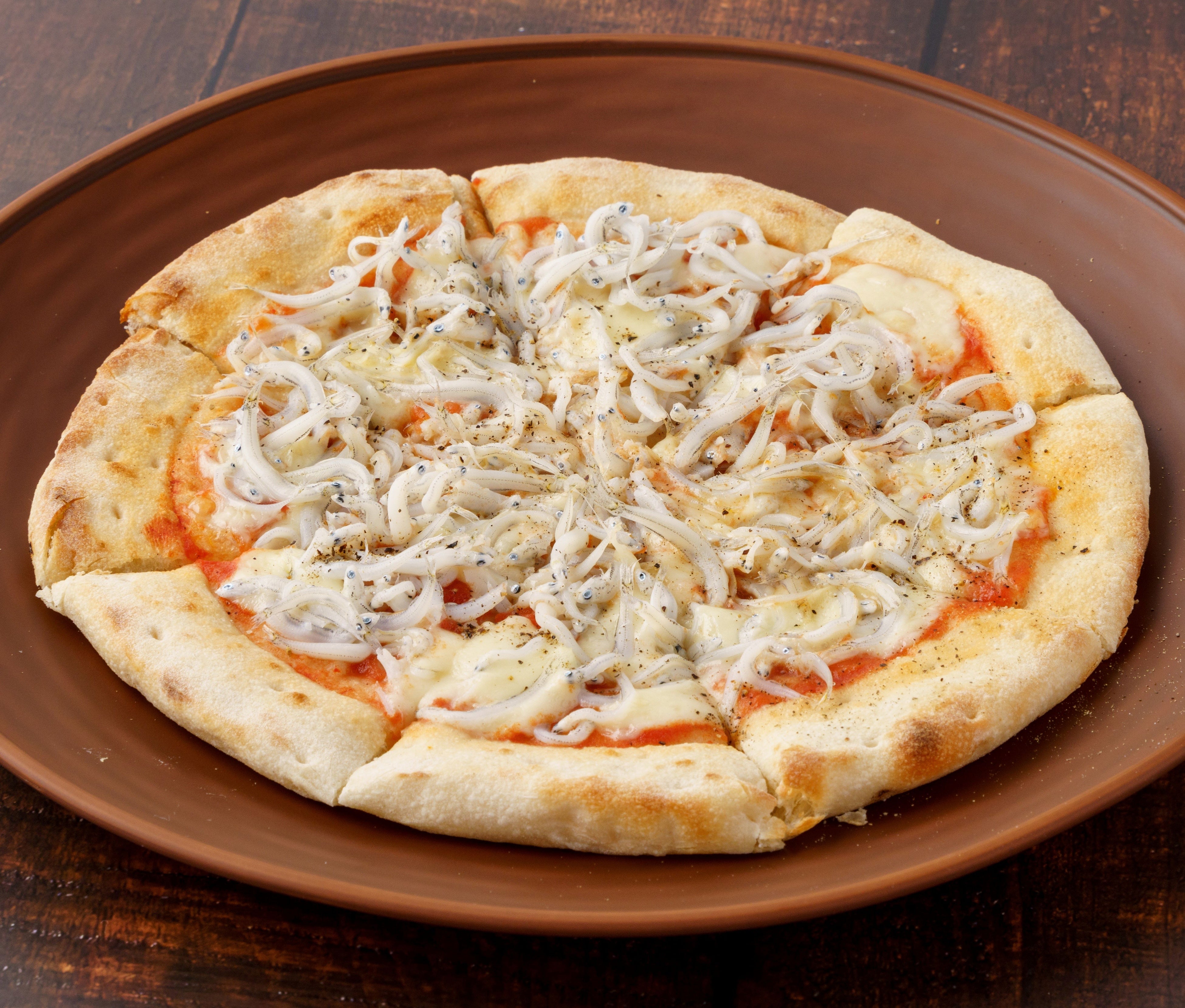 ナポリの伝統的な製法で作ったピザ生地に、イタリア直輸入のモッツァレラチーズを使ったマルゲリータに、和歌山県の七代目山利の春しらすを乗せた季節限定のメニュー。