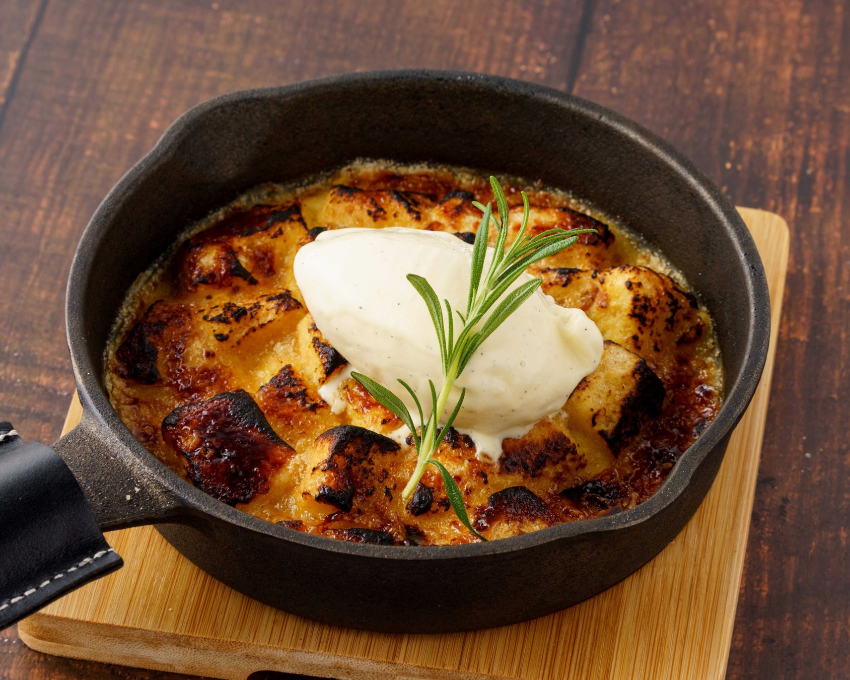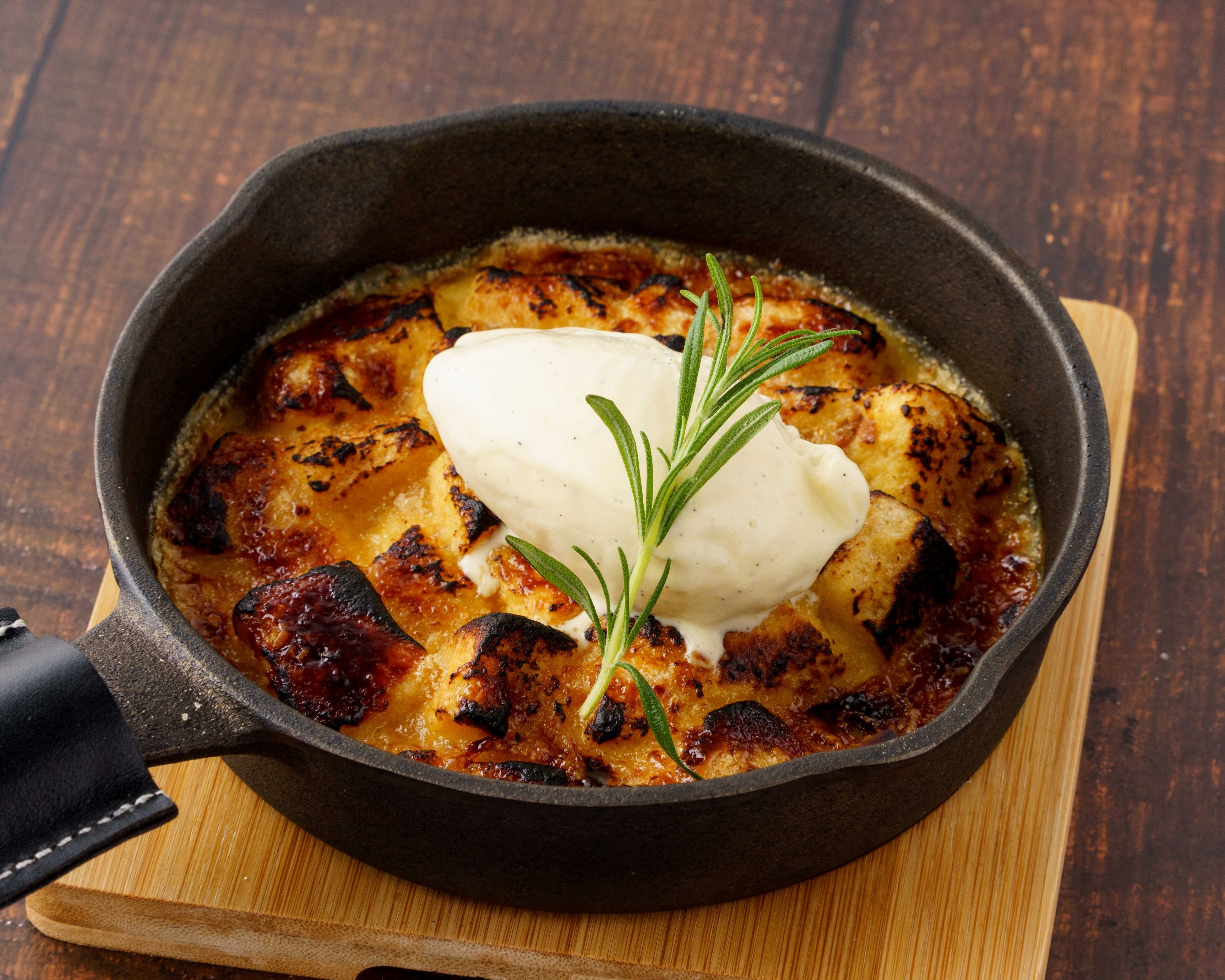 スキレットで焼き上げたバウムクーヘン入りのブリュレ