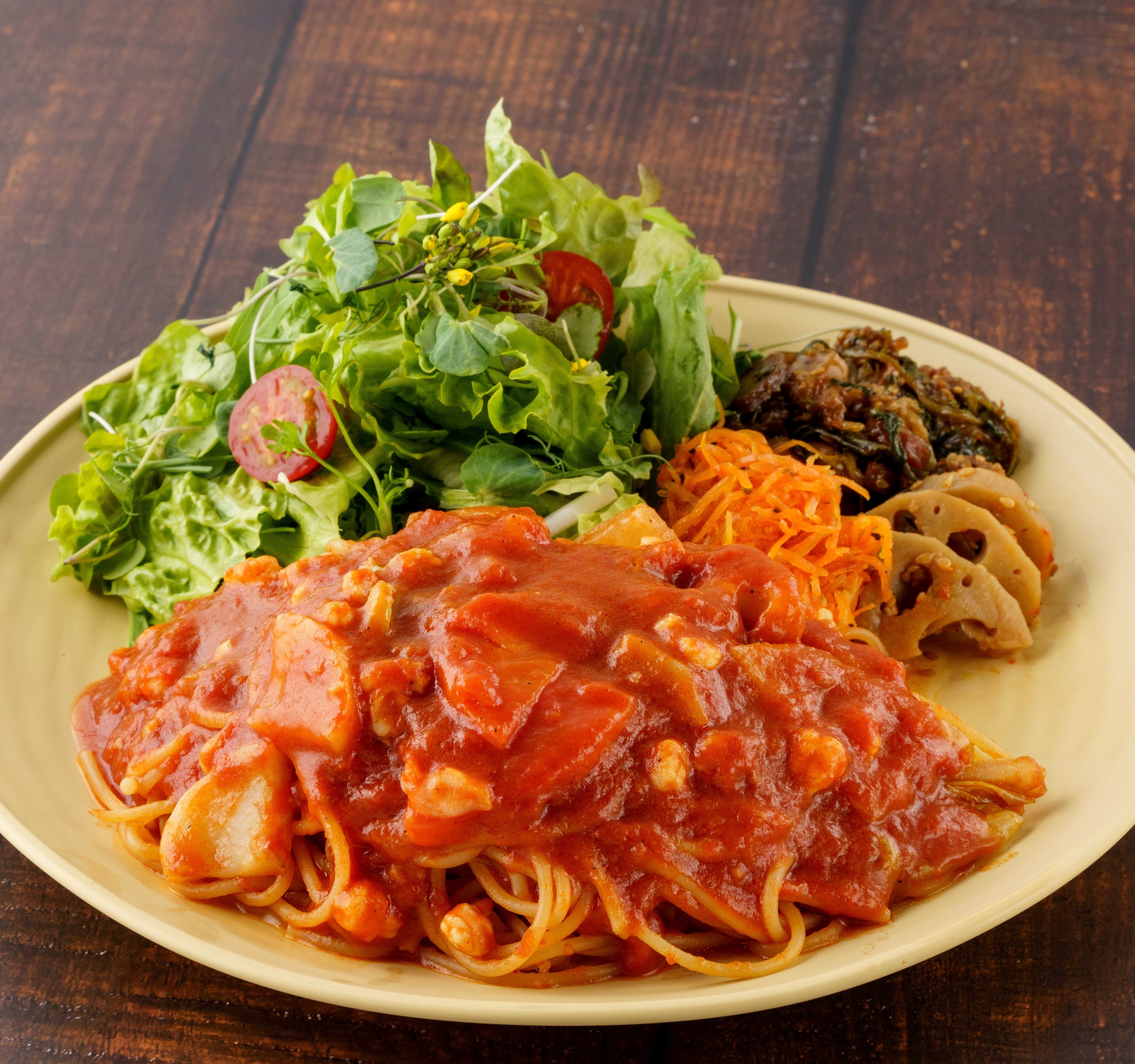 たっぷりの野菜とエビをトマトで軽く煮込んだパスタ。さっぱりかつ濃厚なトマトソースが特徴です。ASC認証のエビを使用。