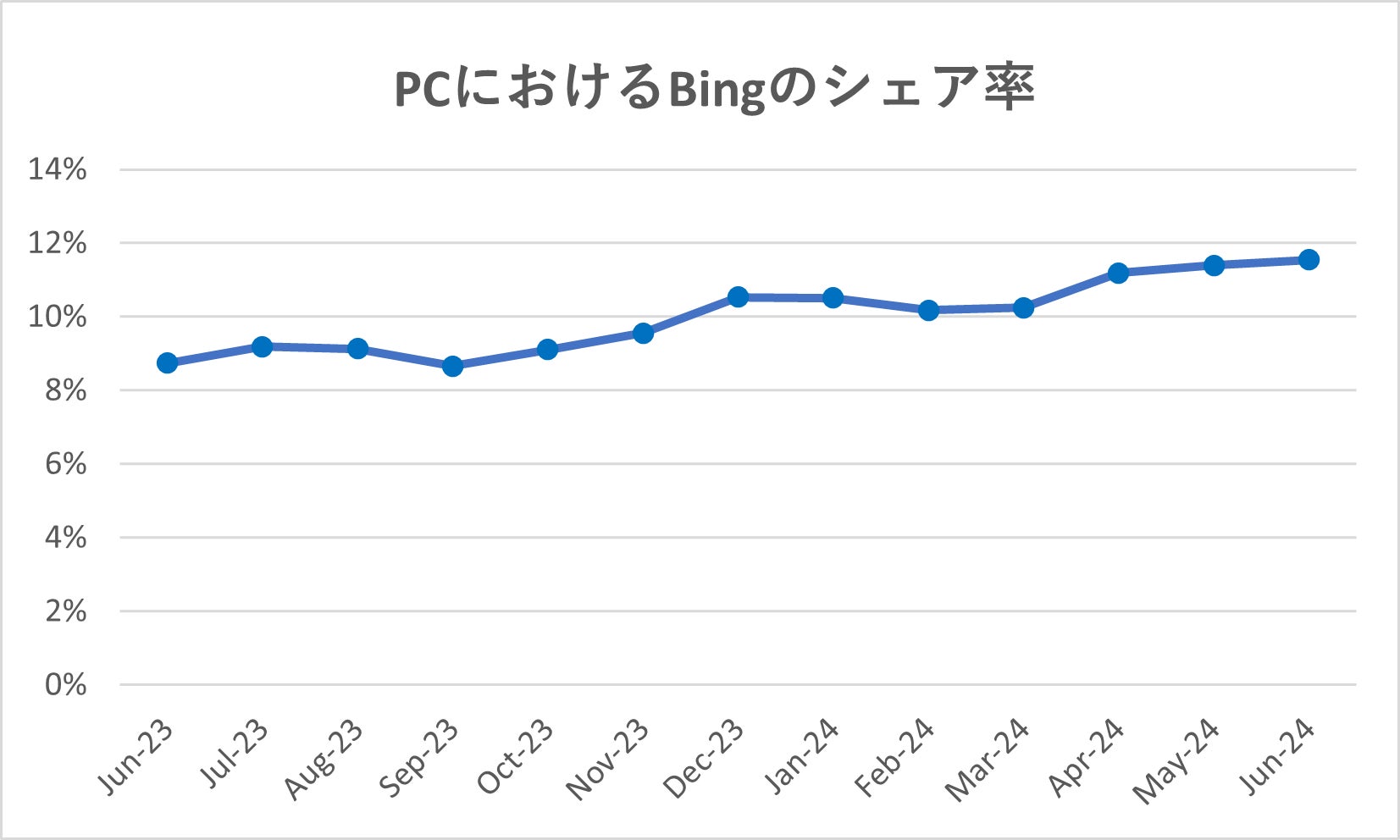 全世界で見ると、Microsoft Bingのシェア率が若干ながらも上がっている傾向が見られました(以下グラフ参照)。その背景としては、2023年2月に公開された「Bing AI(現 Copilot(コパイロット))」がリリースされたこと、さらに2021年10月にリリースされたWindows11において、デフォルトで