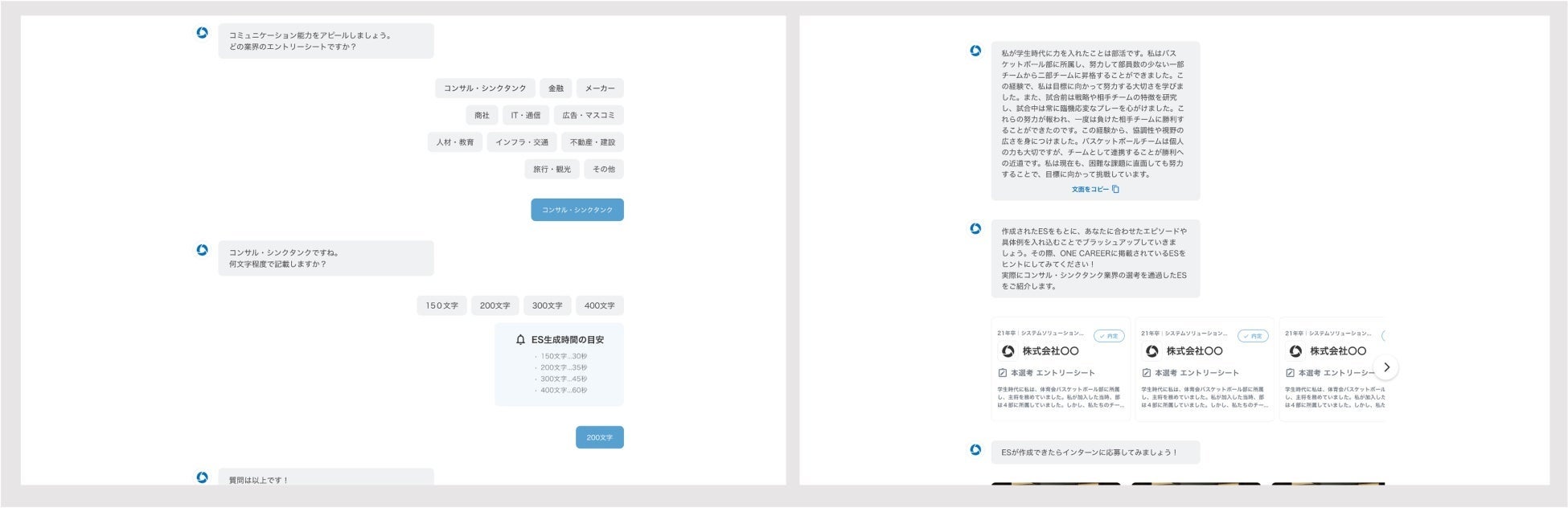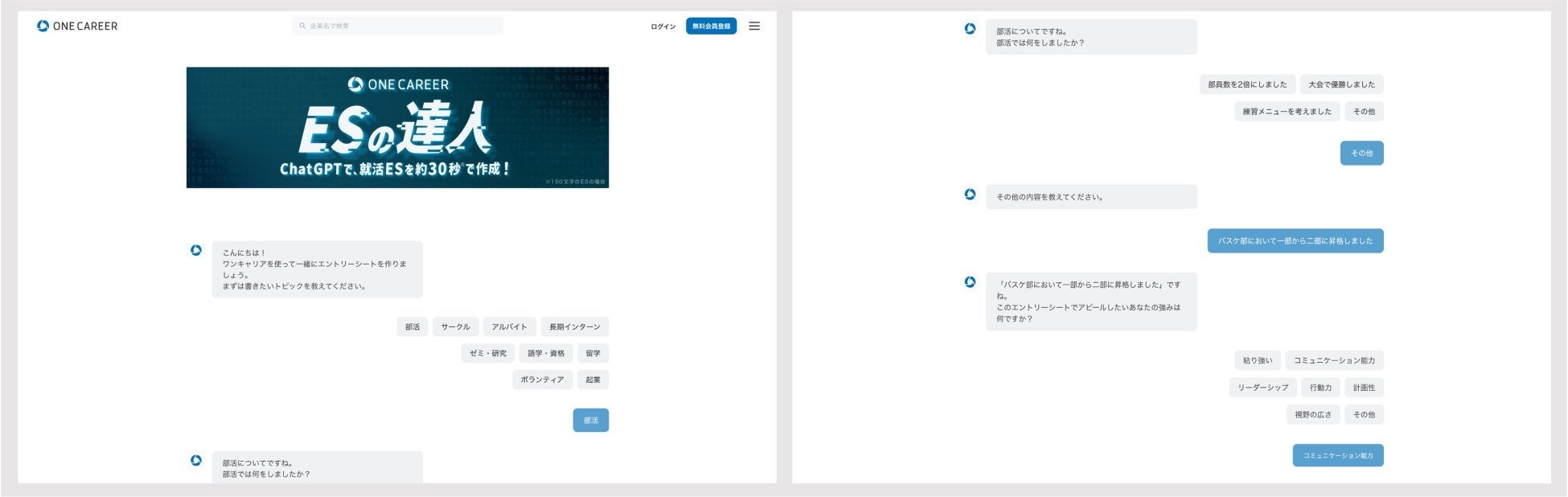 「ESの達人」は、ChatGPT API(最先端の自然言語AIシステムであるChatGPTと同様のテクノロジーにより構築されています)を活用し、就活サイト「ONE CAREER」に投稿された15万件のESデータをもとに、最短約30秒(※1)でESを自動生成するサービスです。就活生が自身の経験などES作成に必要な事項を入力し、志望業界を選択するとESが自動生成されます。これにより、就活生はESの書き方に悩む時間を大幅に削減でき、自身の経験や特徴を振り返ることに集中できるようになります。なお、今回のβ版では、就活のESの中で最も登場頻度の高い「学生時代に力を入れたこと」に特化しています。