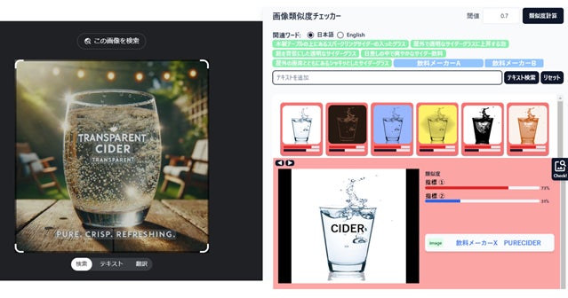 チェック対象の画像と類似画像を複数のアルゴリズムを用いて評価し、類似度順でランキング化し、一定基準を上回る画像をハイライトできる。
