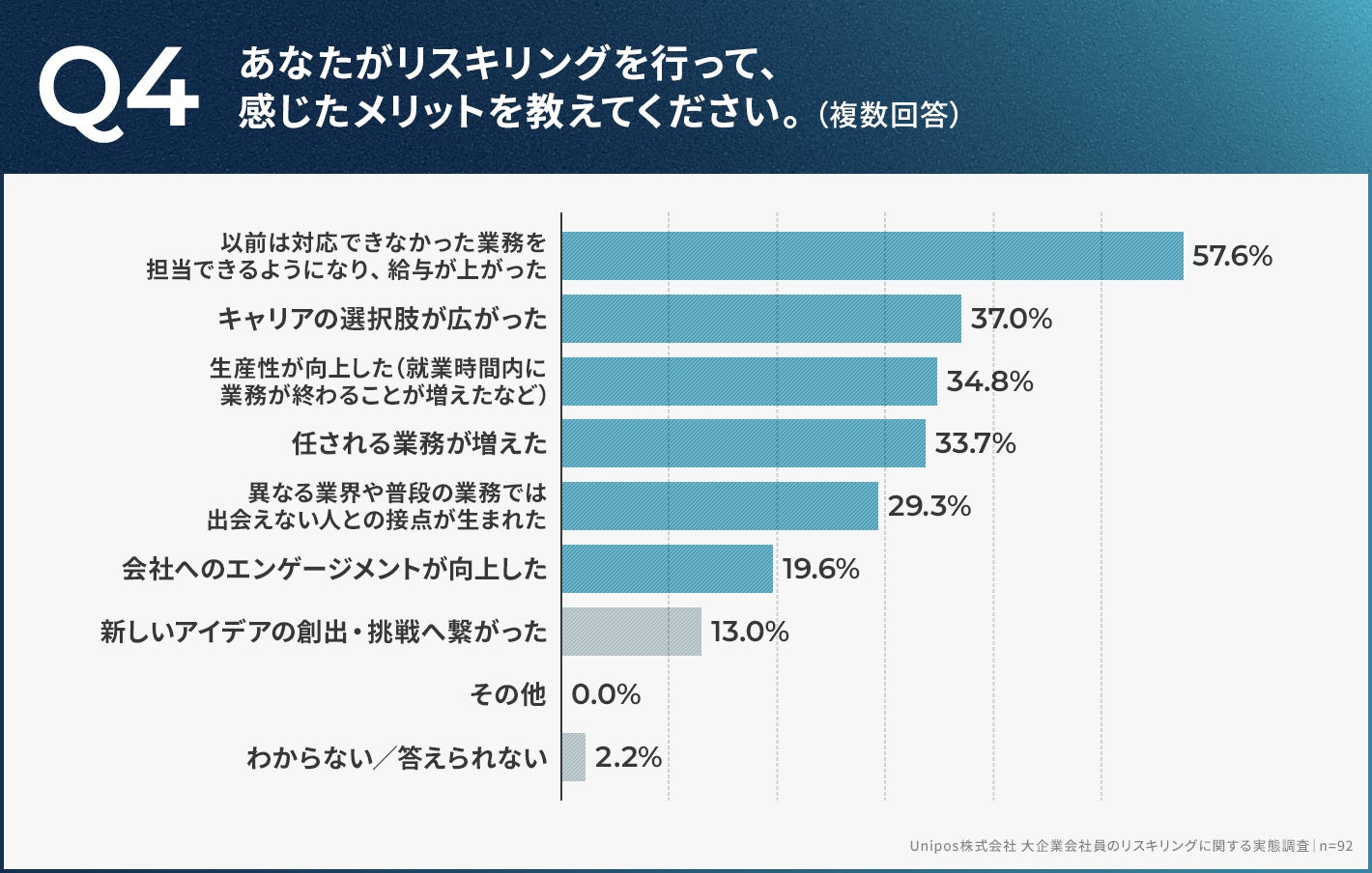 どのようなメリットを感じたかを深掘りすると、最も多かった回答が「以前は対応できなかった業務を担当できるようになり、給与が上がった(57.6%)」。それ以外にも「生産性が向上した(就業時間内に業務が終わることが増えたなど)(34.8%)」「任される業務が増えた(33.7%)」など、第2位の「キャリアの選択肢が広がった」を除くと、既存業務の延長線上での効果を感じている傾向がみられました。