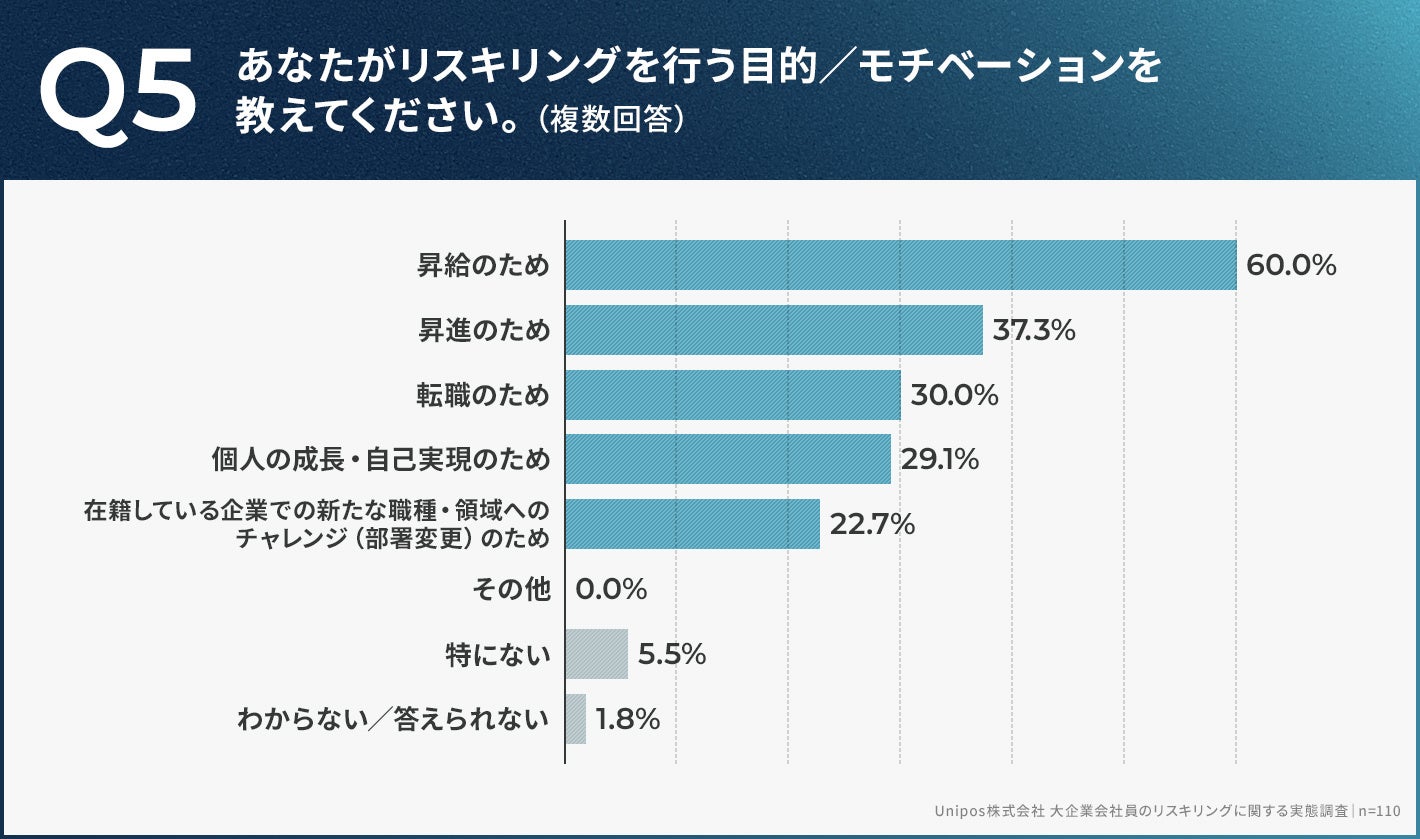 「あなたがリスキリングを行う目的/モチベーションを教えてください」という問いでは、「昇給のため(60.0%)」が1位であることに対して、最下位が「在籍している企業での新たな職種・領域へのチャレンジ(部署変更)のため(22.7%)」となりました。