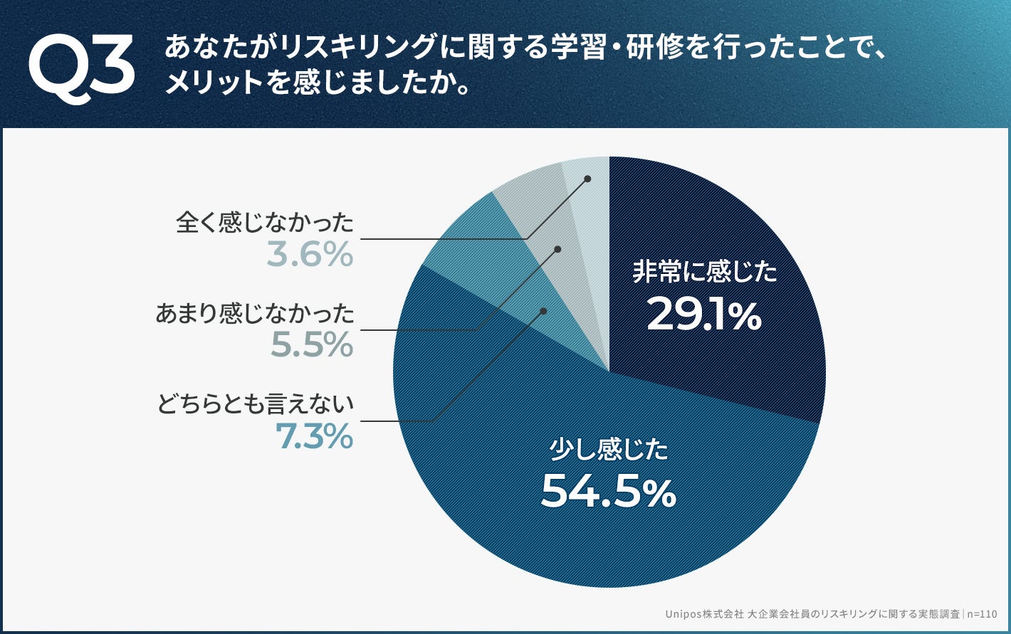 「あなたがリスキリングに関する学習/研修を行ったことで、メリットを感じましたか。」という問いに対しては、「非常に感じた(29.1%)」「少し感じた(54.5%)」と、大多数の83.6%が効果を実感していることが分かりました。
