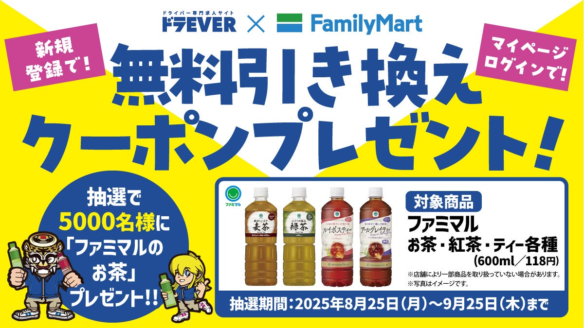 【合計5,000名様に当たる!】日本の物流を支えるドライバーを応援!「ドラEVER」と「ファミリーマート」が再タッグ!「ファミマルのお茶」無料引換クーポンが当たるコラボキャンペーンを開催!